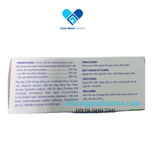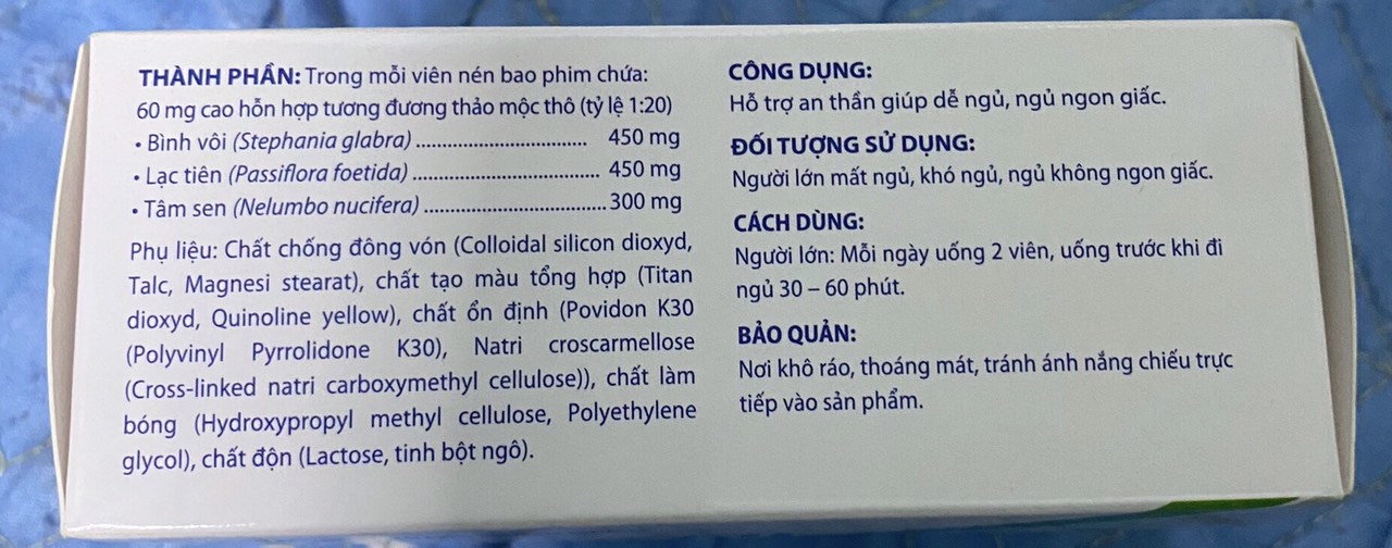 THÀNH PHẦN:Mỗi viên nang cứng 637 mg chứa: - Cao lỏng hỗn hợp 355 mg (tương đương + Lạc tiên 600 mg + Lá Vông nem 600 mg + Trinh nữ 600 mg + Lá