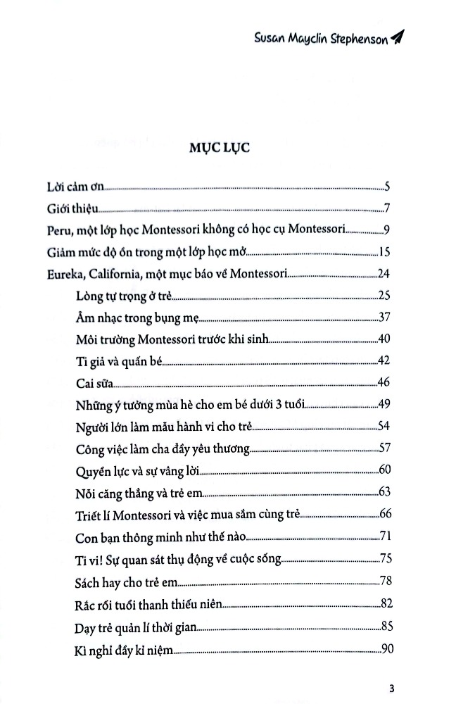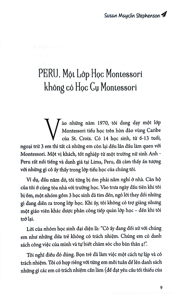 Trong hành trình 50 năm cống hiến cho sự nghiệp giáo dục, Susan Stephenson đã sống ở 5 châu lục, đi đến hơn 70 quốc gia, hoạt động giảng dạy, cố vấn tại hơn 35 nước. Tác giả từng cố vấn cho nhiều trường Montessori, trại mồ côi, trường cho người tị nạn - có hoàn cảnh khó khăn, thậm chí cả những trường không có học cụ Montessori.