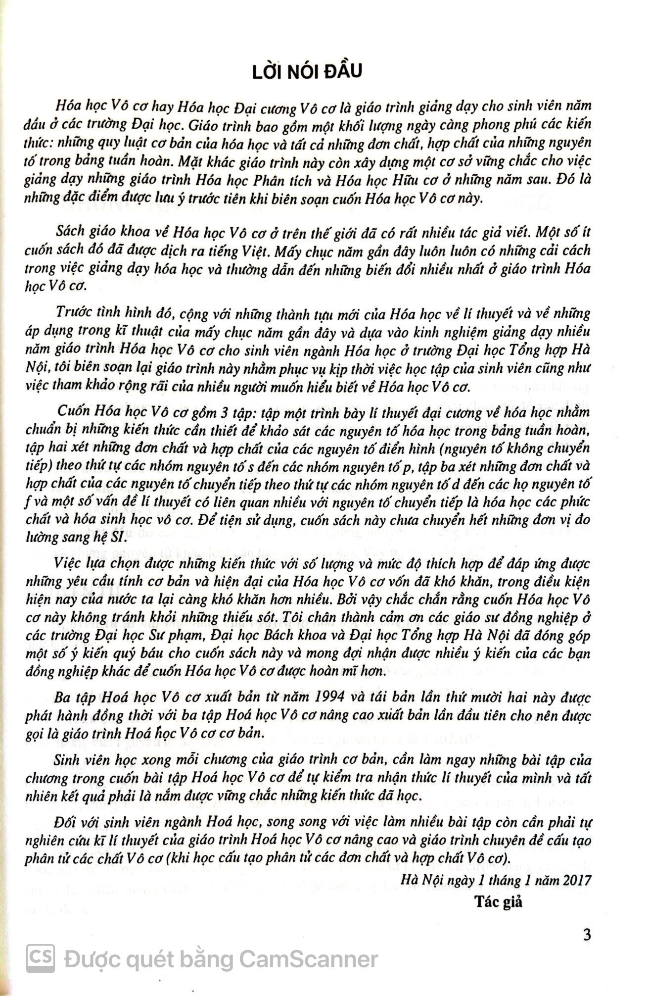 Trước tình hình đó, cộng với những thành tựu mới của Hóa học về lí thuyết và về những áp dụng trong kĩ thuật của mấy chục năm gần đây và dựa vào kinh nghiệm giảng dạy nhiều năm giáo trình Hóa học Vô cơ cho sinh viên ngành Hóa học ở trường Đại học Tổng hợp Hà Nội, tôi biên soạn lại giáo trình này nhằm phục vụ kịp thời việc học tập của sinh viên cũng như việc tham khảo rộng rãi của nhiều người muốn hiểu biết về Hóa học Vô cơ.