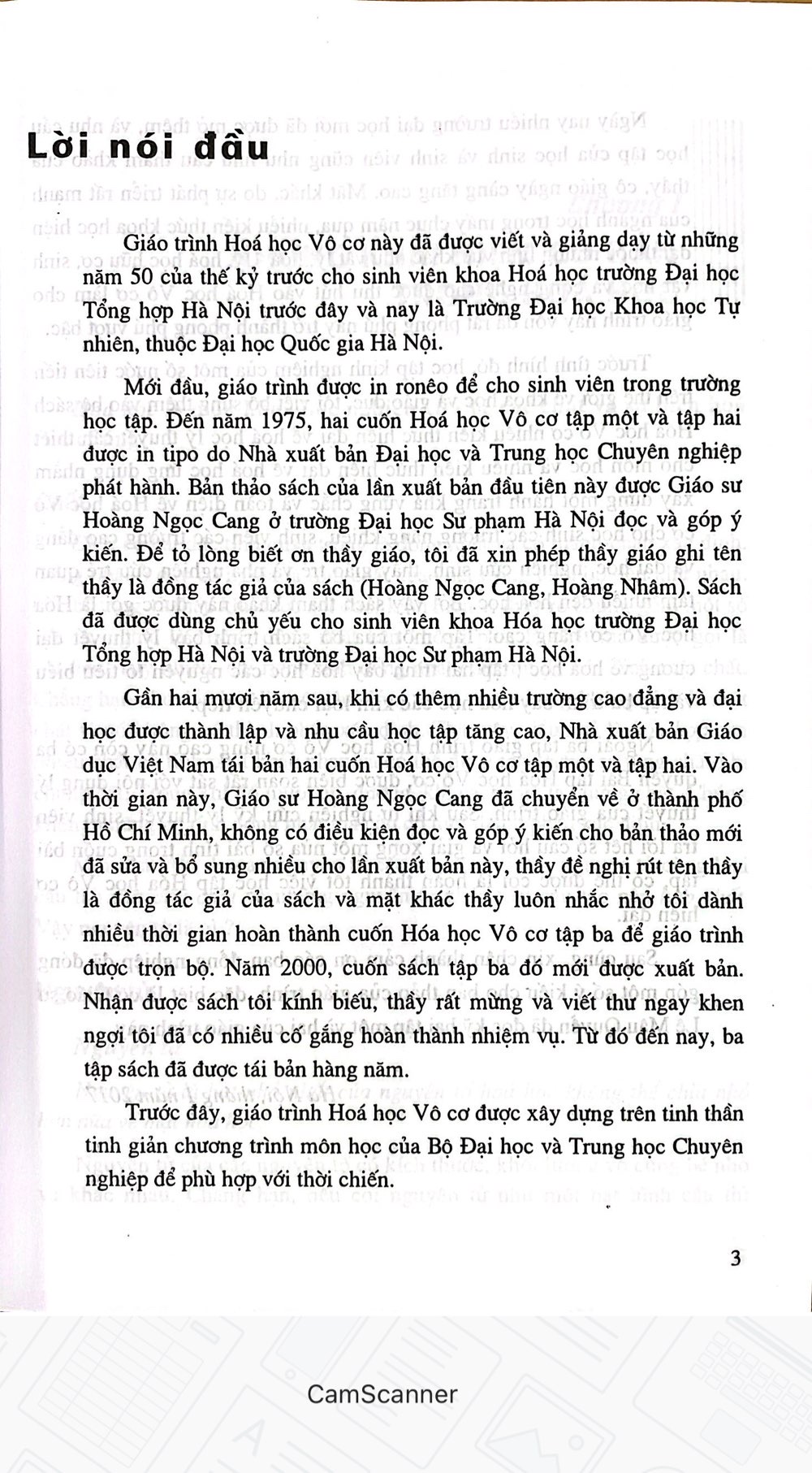 Giáo trình Hoá học Vô cơ này đã được viết và giảng dạy từ những năm 50 của thế kỷ trước cho sinh viên khoa Hoá học trường Đại học Tổng hợp Hà Nội trước đây và nay là Trường Đại học Khoa họ nhiên, thuộc Đại học Quốc gia Hà Nội. Mới đầu, giáo trình được in ronêo để cho sinh viên trong trường học tập. Đến năm 1975, hai cuốn Hoá học Vô cơ tập một và tập hai được in tipo do Nhà xuất bản học và Trung học Chuyên nghiệp phát hành. Bản thảo sách của lần xuất bản đầu tiên này được Giáo sư Hoàng Ngọc Cang ở và góp ý Hà Nội đọc và góp ý kiến. Để tỏ lòng biết ơn thầy giáo, tôi đã xin phép thầy giáo ghi tên thầy là đồng tác giả của sách (Hoàng Ngọc Cang, Hoàng Nhâm). Sách đã được dùng chủ yếu cho sinh viên khoa Hóa học trường Đại học » phạm Hà Tổng hợp Hà Nội và trường Đại học Sư phạm Hà Nội. Gần hai mươi năm sau, khi có thêm nhiều trường cao đẳng và đại học được thành lập và nhu cầu học tập tả tăng cao, Nhà xuất bản Giáo dục Việt Nam tái bản hai cuốn Hoá học Vô cơ tập một và tập hai. Vào thời gian này, Giáo sư Hoàng Ngọc Cang đã chuyển về ở thành phố Hồ Chí Minh, không có điều kiện đọc và góp ý kiến cho tin đã sửa và bổ sung nhiều cho lần nhiều cho lần xuất bản này, thầy đề nghị rút tên thầy là đồng tác giả của sách và mặt khác thầy luôn nhắc nhở tôi dành nhiều thời gian hoàn thành cuốn Hóa học Vô cơ tập ba để giáo trình ghi được trọn bộ. Năm 2000, cuốn sách tập ba đó mới được xuất bản. Nhận được và sách tôi kính biếu, thầy rất mừng và viết thư ngay khen ngợi tôi đã hoàn thành nhiệm vụ. Từ đó đến nay, ba tập đã được tái bản hàng năm. Trước đây, giáo trình Hoá học Vô cơ được xây dựng trên tinh thần tinh giản chương trình môn học của Bộ Đại học và Trung học Chuyên nghiệp để phù hợp với thời chiến.