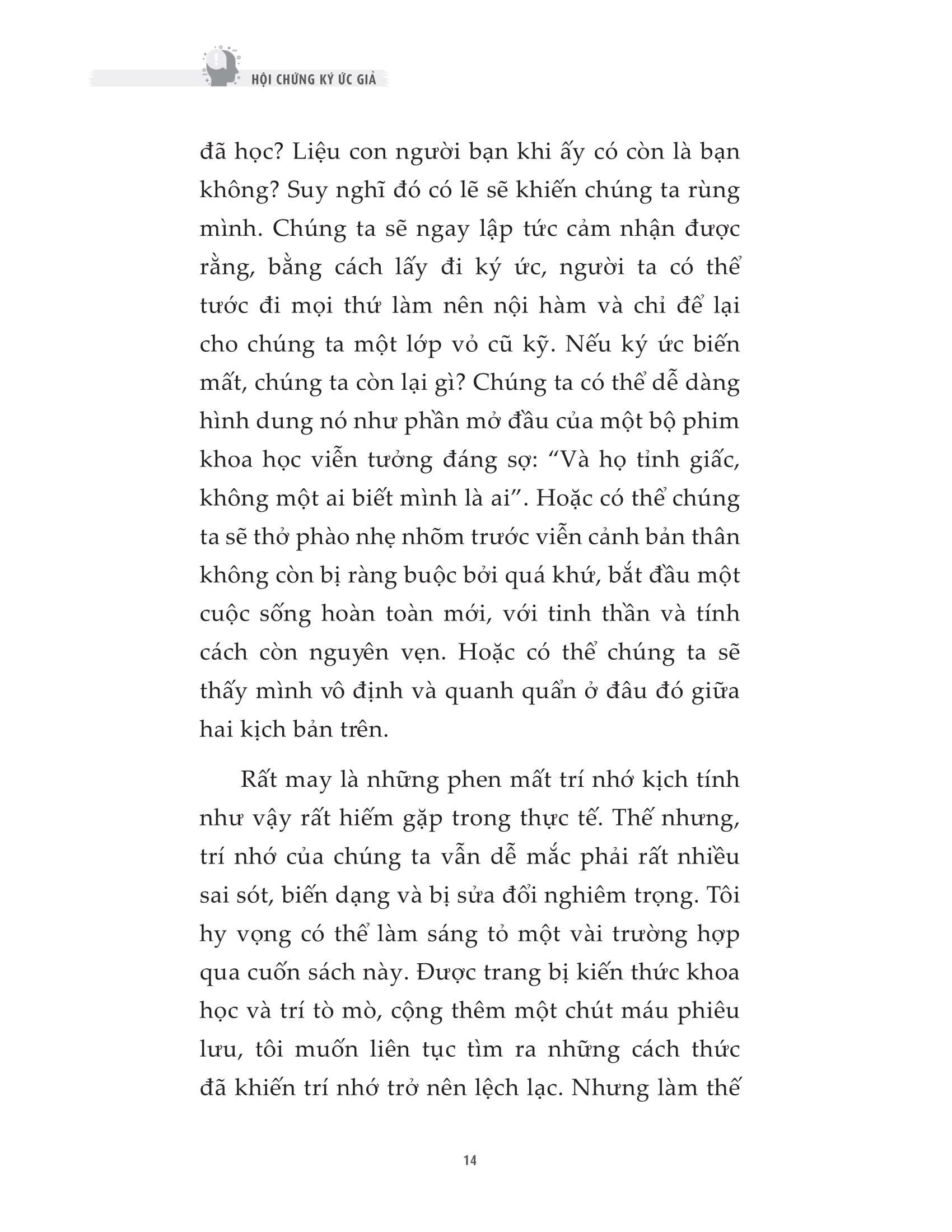 - Bạn nghĩ rằng mọi ký ức của m.ình đều hoàn toàn chính xác? Những lỗi trong quá trình ghi nhớ của chúng ta diễn ra rất phổ biến. Mọi người thường nghĩ rằng bộ não của chúng ta ghi nhớ như một thứ giống như một máy ghi hình - ghi lại và lưu trữ mọi thứ xảy ra với độ chính xác tuyệt đối . Trong thực tế, rất dễ mắc các lỗi trong việc ghi nhớ. Nhiều người có thể vô cùng tự tin rằng trí nhớ của họ chính xác, nhưng thực tế đáng buồn là, trí nhớ không phải bản ghi chép quá khứ chính xác và hoàn hảo như chúng ta vẫn tưởng. Ký ức liên tục biến mất. Ta bước vào phòng và ngay lập tức quên mất m.ình vào đây để làm gì, hoặc ta đột nhiên không thể nhớ ra tên của một người mà m.ình đã gặp nhiều lần trước đó. Vậy hãy thử tưởng tượng, những hậu quả nghiêm trọng nào có thể bị kéo theo, nếu như bộ nhớ đầy thiếu sót của ta không những quên, mà còn có nguy cơ bóp méo thông tin và thêu dệt nên một ký ức hoàn toàn mới - ngay cả khi chuyện đó chưa từng xảy ra? Hội chứng ký ức giả là cuốn sách tổng hợp những nghiên cứu mới nhất về não bộ và trí nhớ: cơ chế ghi nhớ của não bộ, các yếu tố hình thành nên những ký ức không có thật và một số nguyên tắc để cải thiện trí nhớ. Trong cuốn Hội chứng ký ức giả, nhà tâm lý học pháp y, đồng thời là chuyên gia về trí nhớ, Tiến sĩ Julia Shaw đ.ã sử dụng những nghiên cứu mới nhất cho thấy cách bộ não của chúng ta bóp méo ký ức đúng đắn và tạo ra những ký ức về sự kiện không có thực. Cuốn sách đưa ra các dẫn chứng cho người đọc hiểu rằng, ký ức giả không chỉ ảnh hưởng tới chính bản thân người sở hữu ký ức đó, mà còn ảnh hưởng tới xã hội như thế nào: Ký ức giả có thể khiến chúng ta tự tin thái quá vào khả năng ghi nhớ của chính m.ình, khiến cảnh sát bỏ tù không ít người vô tội, thậm chí có thể khiến một người nổi tiếng tiêu tan sự nghiệ Không chỉ có vậy, cuốn sách còn tiết lộ cách để cải thiện trí nhớ thông qua việc thừa nhận ký ức có nguy cơ bị sai sót. Từ đó, người đọc không chỉ sở hữu những kiến thức về khoa học trí nhớ, mà còn biết thêm nhiều phương pháp giúp tăng cường khả năng lưu giữ thông tin chính xác và hiệu quả. Lôi cuốn và đầy bất ngờ, Hội chứng ký ức giả chính là một người bạn đồng hành trên con đường khám phá bản thân chúng ta dựa trên cơ sở khoa học về trí nhớ. Cuốn sách này sẽ giúp chúng ta hiểu hơn về cách ghi nhớ của não bộ, về tính đúng đắn của những ký ức mà ta sở hữu, khiến bạn phải đặt câu hỏi rằng bạn thực sự hiểu bản thân m.ình đến mức nào. Về tác giả Tiến sĩ Julia Shaw là một giảng viên và nhà nghiên cứu kỳ cựu của Trường Luật và Khoa học Xã hội, Đại học London South Bank, đồng thời là một trong số ít chuyên gia trên thế giới thực hiện nghiên cứu về những sai sót trí nhớ phức tạp liên quan đến các sự kiện cảm xúc cá nhân - hay còn gọi là những “ký ức sống động nhưng hoàn toàn không có thật”. Tiến sĩ Shaw xuất bản nhiều bài viết khoa học trên các tạp chí học thuật quốc tế, xây dựng giáo trình, thường xuyên cộng tác với tạp chí khoa học nổi tiếng Scientific American, thỉnh giảng và tham gia thuyết trình tại các hội thảo trên khắp thế giới. Cô cũng giảng dạy các lớp ở bậc đại học và sau đại học, đồng thời đã thắng hai giải thưởng dạy học xuất sắc.