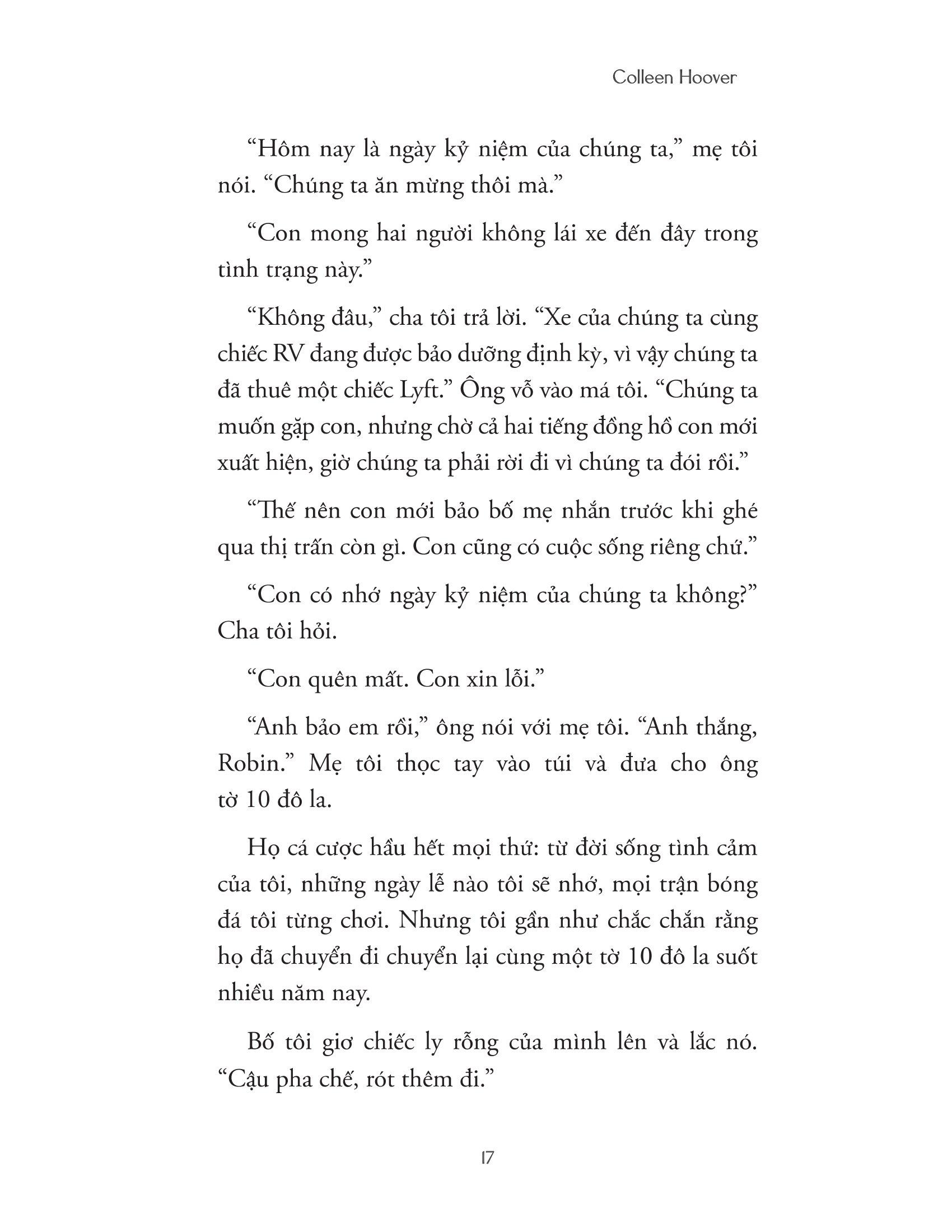 “Cuốn sách mới của Colleen Hoover sẽ xé nát rồi chữa lành trái tim bạn… Một tuyệt tác đầy cảm động về mất mát và hy vọng, nỗi hối hận và tha thứ, và rằng tình yêu có thể chữa lành mọi thứ.” ―POPSUGAR
