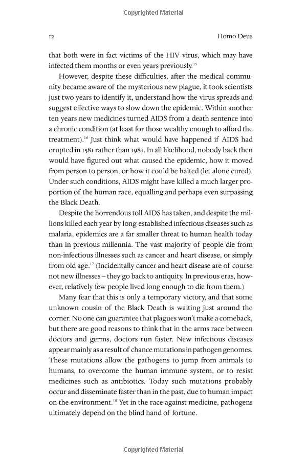 Over the past century humankind has managed to do the impossible and rein in famine, plague, and war. This may seem hard to accept, but, as Harari explains in his trademark style--thorough, yet riveting--famine, plague and war have been transformed from incomprehensible and uncontrollable forces of nature into manageable challenges. For the first time ever, more people die from eating too much than from eating too little; more people die from old age than from infectious diseases; and more people commit suicide than are killed by soldiers, terrorists and criminals put together. The average American is a thousand times more likely to die from binging at McDonalds than from being blown up by Al Qaeda.