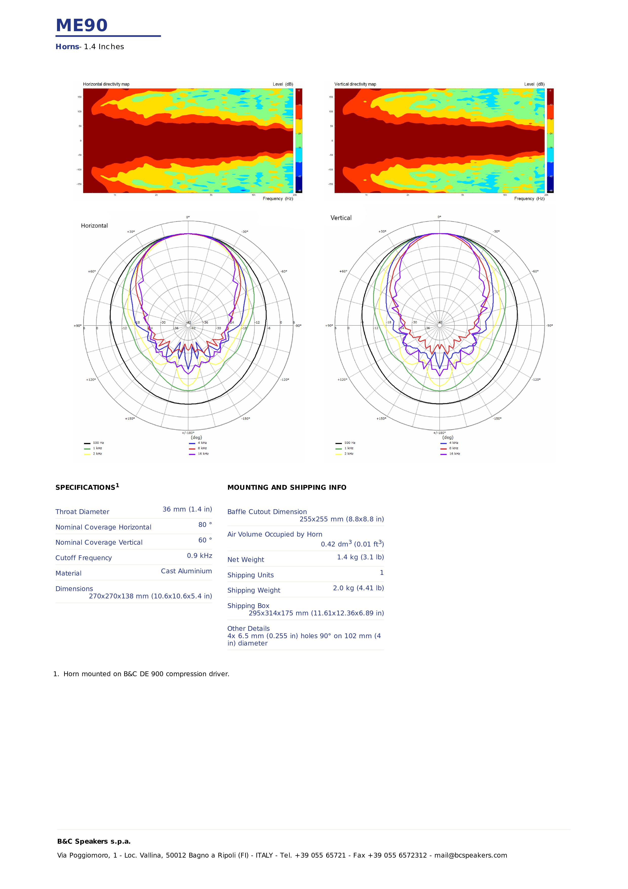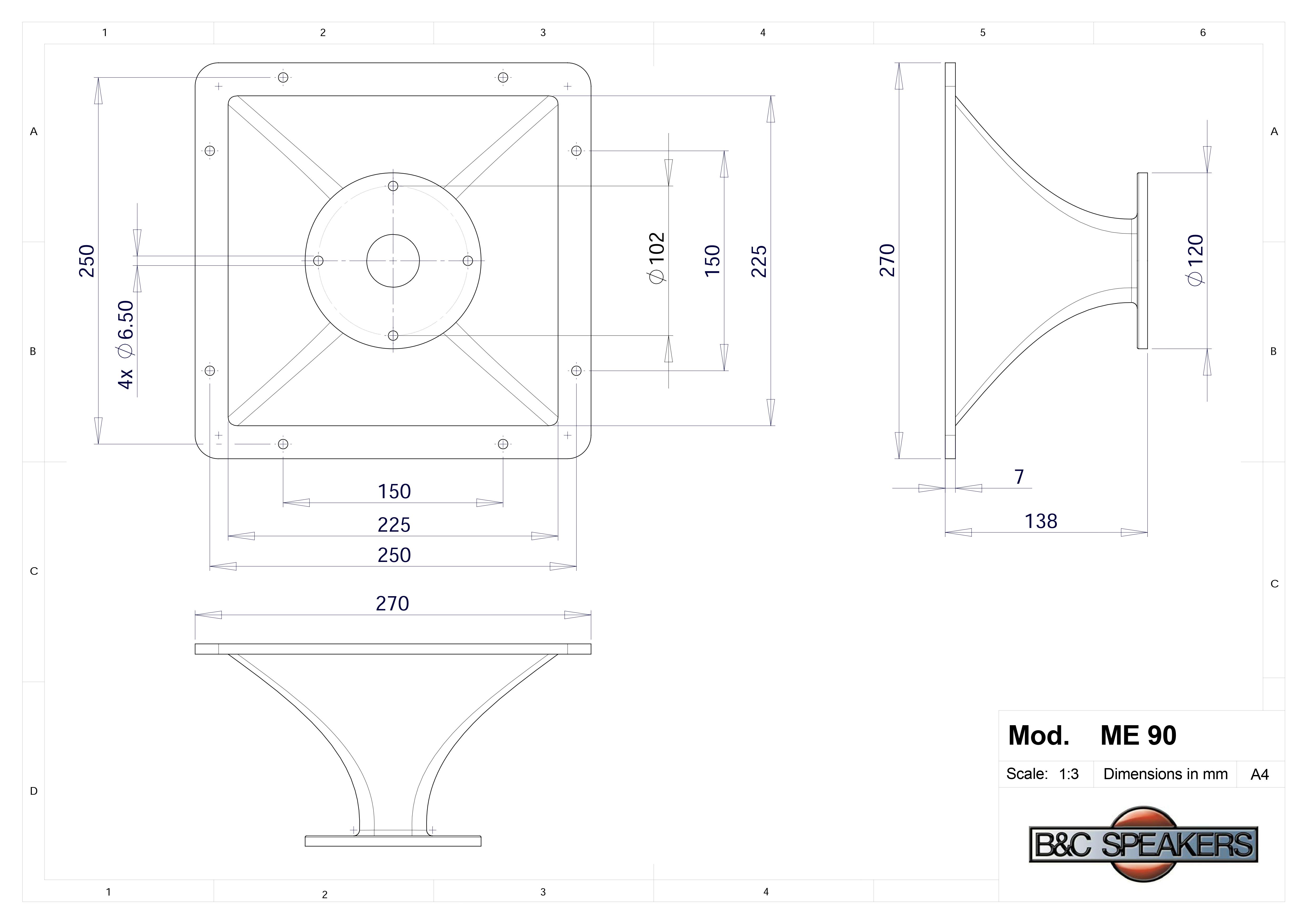 HỌNG LOA TREBLE B&C SPEAKERS ME90 Họng 1.4 (36mm) Độ phủ ngang: 80° Độ phủ dọc: 60° Tải xuống được tới 900Hz Khối lượng: 1.4 kg Kích thước: 270 x 270 x138 mm