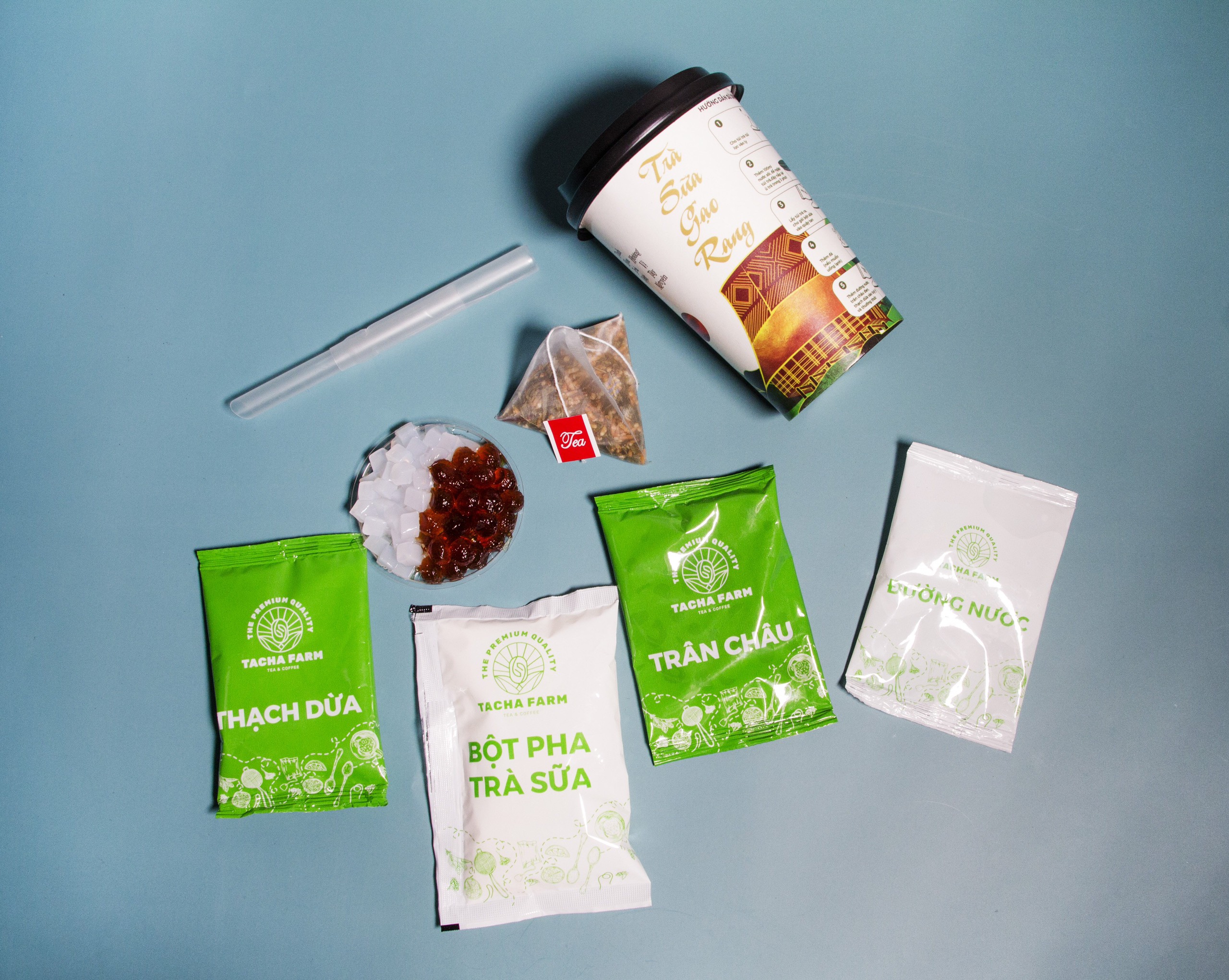 Trong 1 ly trà sữa tự pha TACHA FARM vị Hồng Trà sữa nướng gồm: - 1 Túi trà túi lọc vị hồng trà nướng - 1 túi bột pha trà sữa - 1 túi