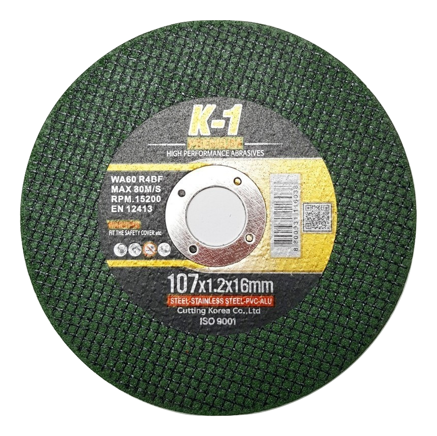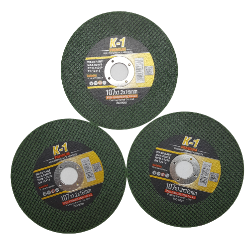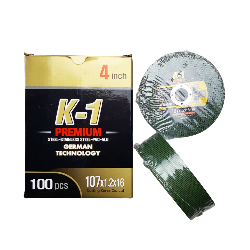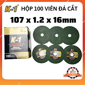 Tên thường gọi: Đá cắt K1 xanh 107 *** THÔNG TIN SẢN PHẨM - Kích thước: 107 x 1.2 x 16mm - Màu: xanh - Số lượng: 100 viên - Công dụng: cắt sắt, gia