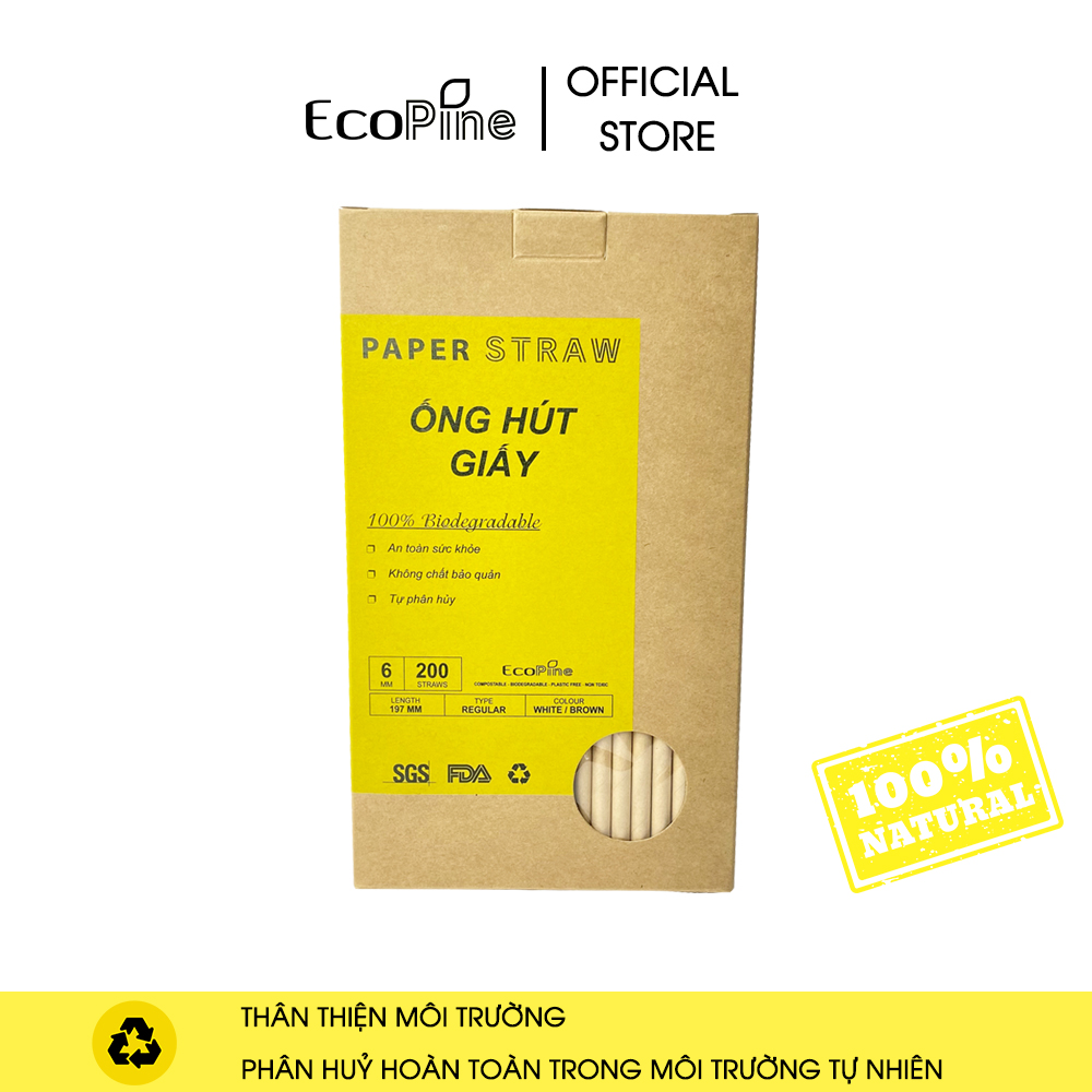 ✨Hộp 200 ống hút giấy phi 6mm màu nâu kraft ECOPINE - Dùng cho cafe, nước ngọt, nước ép