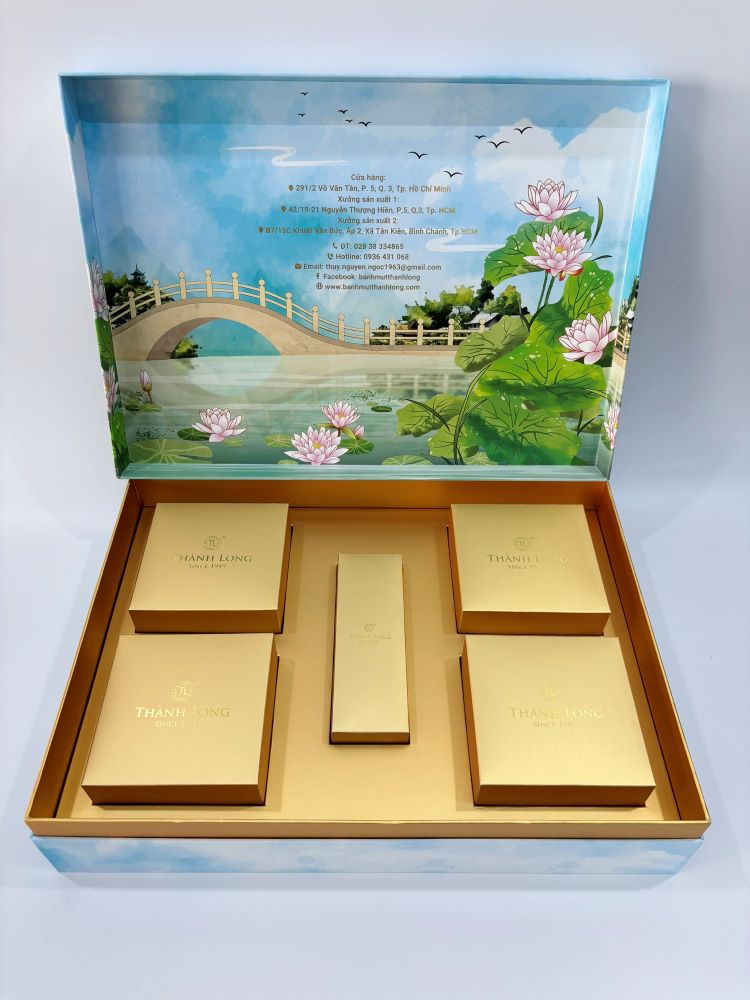 Với sản phẩm tươi sống, trọng lượng thực tế có thể chênh lệch khoảng 10%. Hộp bánh trung thu 4 bánh 2 trứng 270g - Thịnh Vượng - Thành Long 1080g - tặng 1 hộp