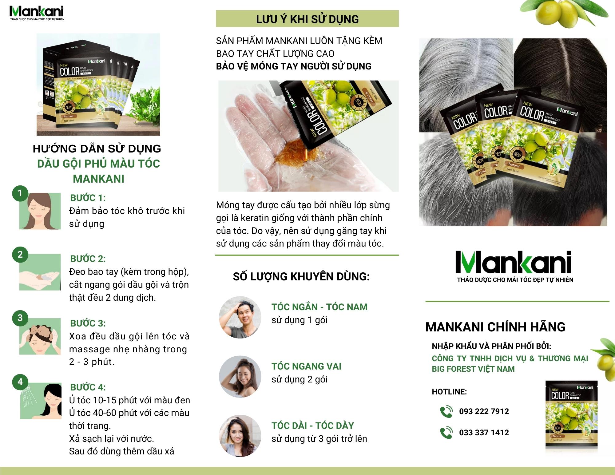 Hộp dầu gội nhuộm tóc, phủ bạc thảo dược tự nhiên Nâu Đen Mankani [10 Gói ~ 250ml - Chính Hãng] Mô tả : Ưu điểm vượt trội : ✓ Không bị xơ tóc khi sử dụng ✓ Kích thích tóc con mọc ra màu đen. ✓ Tiện lợi khi sử dụng, có thể gội ngay tại nhà. ✓ Khi gội bọt có màu trắng. Không dính da đầu và da tay ✓ Là dầu gội đầu, hương thơm dễ chịu, không dính da đầu. ✓ Chiết xuất từ thảo dược tự nhiên quý hiếm làm tóc hấp thụ dễ dàng chỉ sau 1 - 2 lần gội.   Khắc phục 5 nhược điểm : ✓ Giá cả hợp lý, sử dụng dễ dàng ✓ Tiết kiệm thời gian cho bạn không phải phụ thuộc và chờ đợi thợ nhuộm tóc ✓ Tóc mềm, mượt không bị tẩy màu nên vẫn giữ được cấu trúc vốn có của tóc ✓ Sản phẩm có nguồn gốc thảo dược, không gây kích ứng da so với thuốc nhuộm tóc.   Dành cho : ✓ Người già cần phủ bạc ✓ Giới trẻ muốn cải thiện mái tóc ✓ Những ai muốn tiết kiệm chi phí và thời gian ✓ Những ai muốn đổi màu tóc nhưng ngại hoá chất độc hại   HD Sử dụng : ✓ Gội khô, thoa dầu gội lên tóc, sử dụng lược hoặc massage đều tay ✓ Với màu đen tự nhiên : Ủ Chờ khoảng 5→10 phút tùy chất tóc để tinh chất thấm sâu vào từng sợi tóc ✓ Với màu thời trang : Ủ Chờ khoảng 30 → 40 phút tùy chất tóc để tinh chất thấm sâu vào từng sợi tóc Với tóc bạc nhiều trên 50% thì Quý khách nên sử dụng màu đen tự nhiên ️: Màu tóc đen nhẹ nhàng khi còn trẻ Với màu thời trang lên đẹp nhất trên nền tóc đen và che phủ tóc có tỉ lệ tóc trắng dưới 30%   Thông tin sản phẩm : ️ ✓ Đóng gói : Gói / Hộp ️ ✓ Dung tích : 10 gói x 25 ml ️ ✓ Màu sắc : Nâu Đen, màu trầm trong văn phòng, ra nắng sáng nâu đen ️✓ Thành phần : Các thảo dược quý và có nguồn gốc 100% thiên nhiên tốt cho tóc : Nhân sâm, Mật ong, Tinh dầu ô liu, Nước ép trái cây Morinda Citrifolia, Nha đam, Quả hàu, Gừng, Dầu Argan … Công ty TNHH Thương Mại & Dịch Vụ Big Forest Việt Nam   ️ Big Forest Store - Khách Lạ là Khách Quen ️ ️ ✓Gì cũng Có Lẻ mà rẻ như Buôn ✓Sản phẩm giống mô tả Chỉ sản phẩm chính hãng 100%