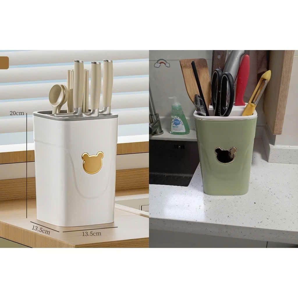 Màu sắc: Trắng và Vàng nâu kích thước:13.5x13.5x20cm Chất liệu: Nhựa PP Công dụng: để đũa, muỗng, dao, kéo, các dụng cụ nấu ăn khác. Sản phẩm: gồm 1 hộp đựng (không bao gồm dao