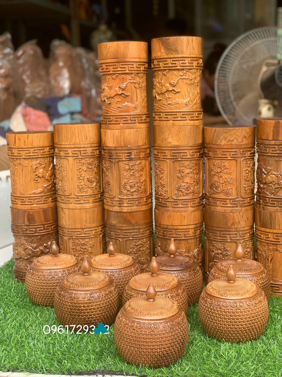 _ Hôp đựng trà chè được làm bằng chất liệu gỗ bách xanh liền khối tự nhiên 100% _ Kt cao 20×10cm _ Hộp được chạm khắc nhiều hoa văn khác nhau ,khắc tích tứ