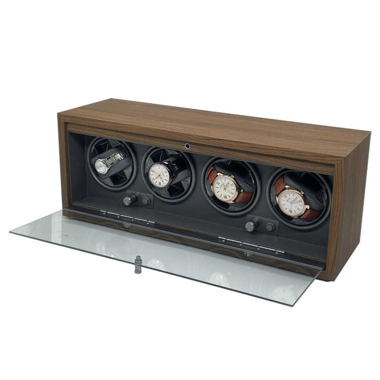 Hộp Xoay Đồng Hồ Cơ 4 Ngăn Có Đèn LED Vỏ Gỗ Sần - T04NL