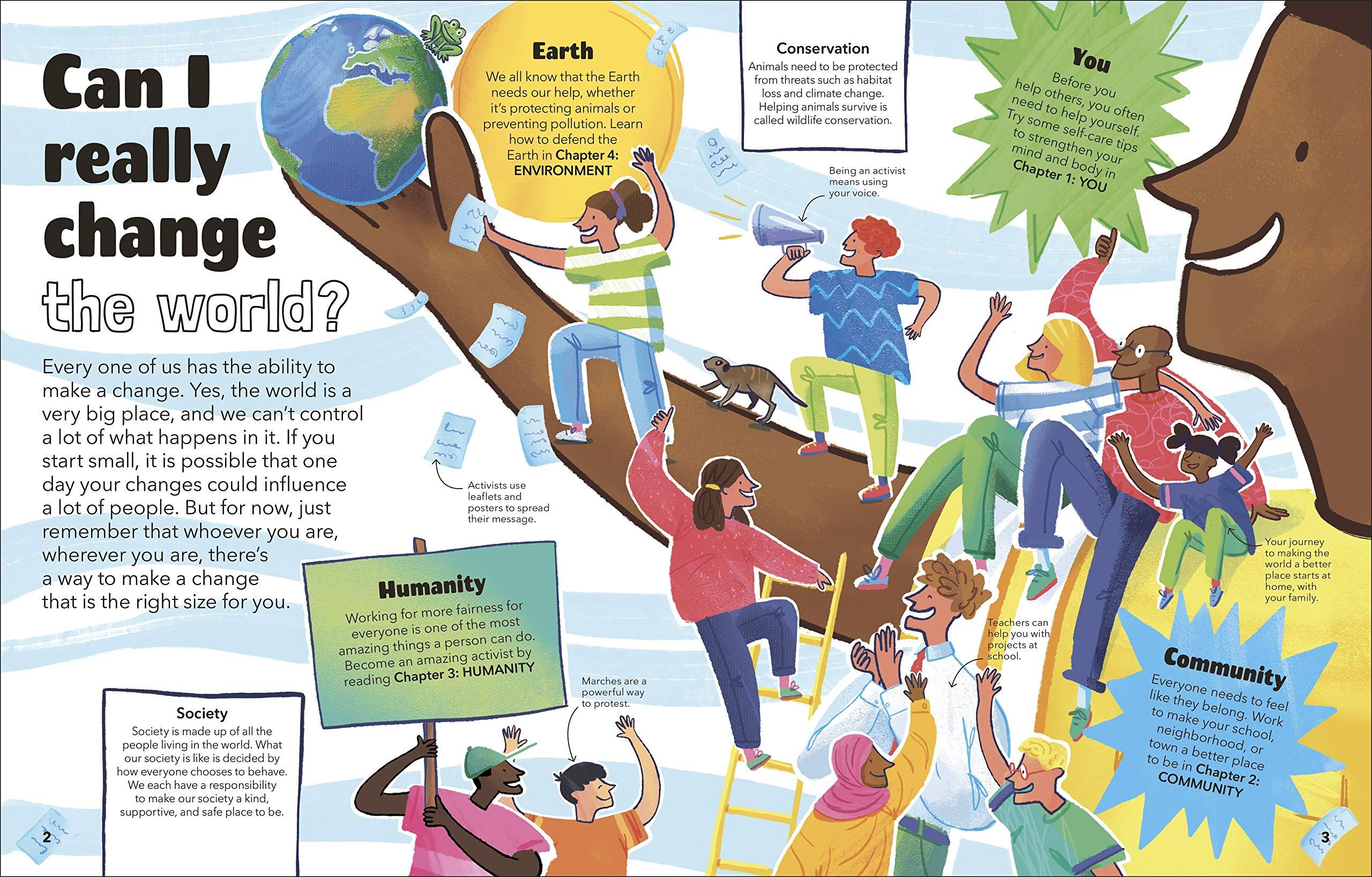 Through ideas as small as creating a neighborhood lending library to as important as public speaking and how to talk about politics, How to Make a Better World is a practical guide to activism for children.Well-written and divided into sections on You, Community, Environment, and more, this educational book helps children to look at what they might like to achieve, and the logical approach makes it easy to navigate if you want to tie topics up with school projects. Brightly illustrated inclusive art makes this factbook as visually appealing as its message. You can easily jump around without any loss of comprehension and dip in for short or longer periods. Learn about tricky social interactions like friendship fallouts, or bullying and how to maneuver them, or find out how to go about creating activist campaigns to tackle climate change or social injustice.If kids are to think positive thoughts and be part of movements for positive change, they need to be encouraged to do it. This book is full of wonderful facts about the world, presenting such positivity as cool, sensible, exciting, and achievable. The perfect starter book to activism for kids.Make A Change - Change The World!If you want to create a better world that is equally awesome for everyone, this book is for you