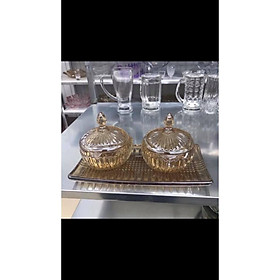 ✨Hũ thủy tinh đựng mứt đôi kèm khay thủy tinh vàng