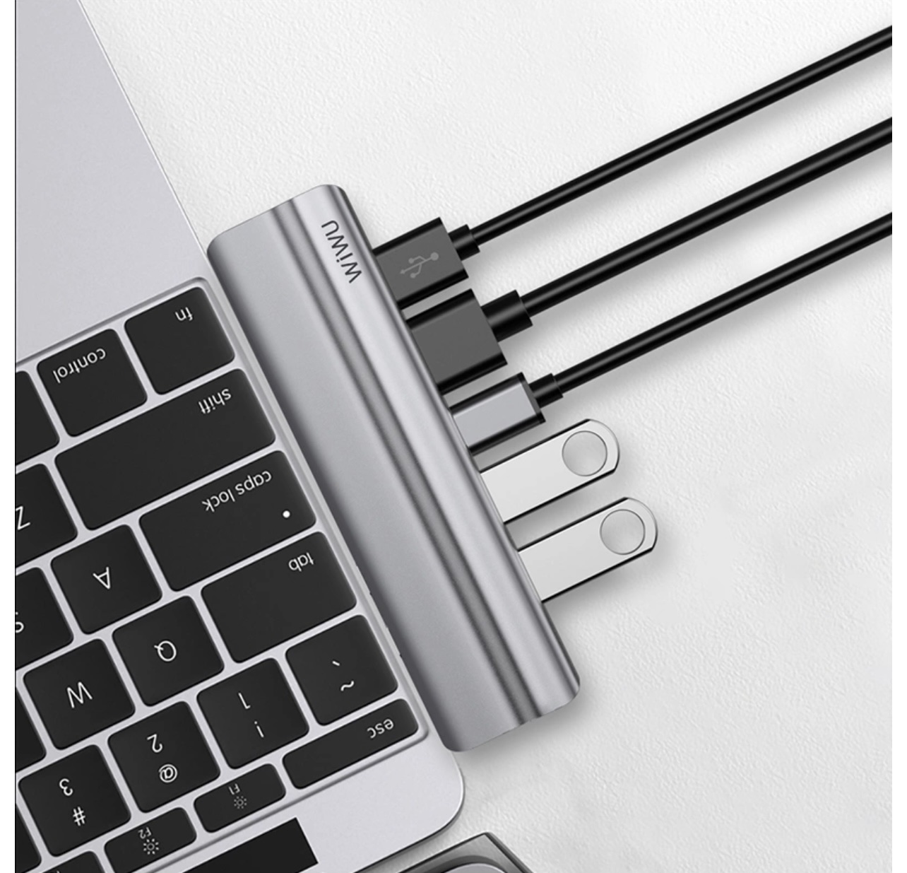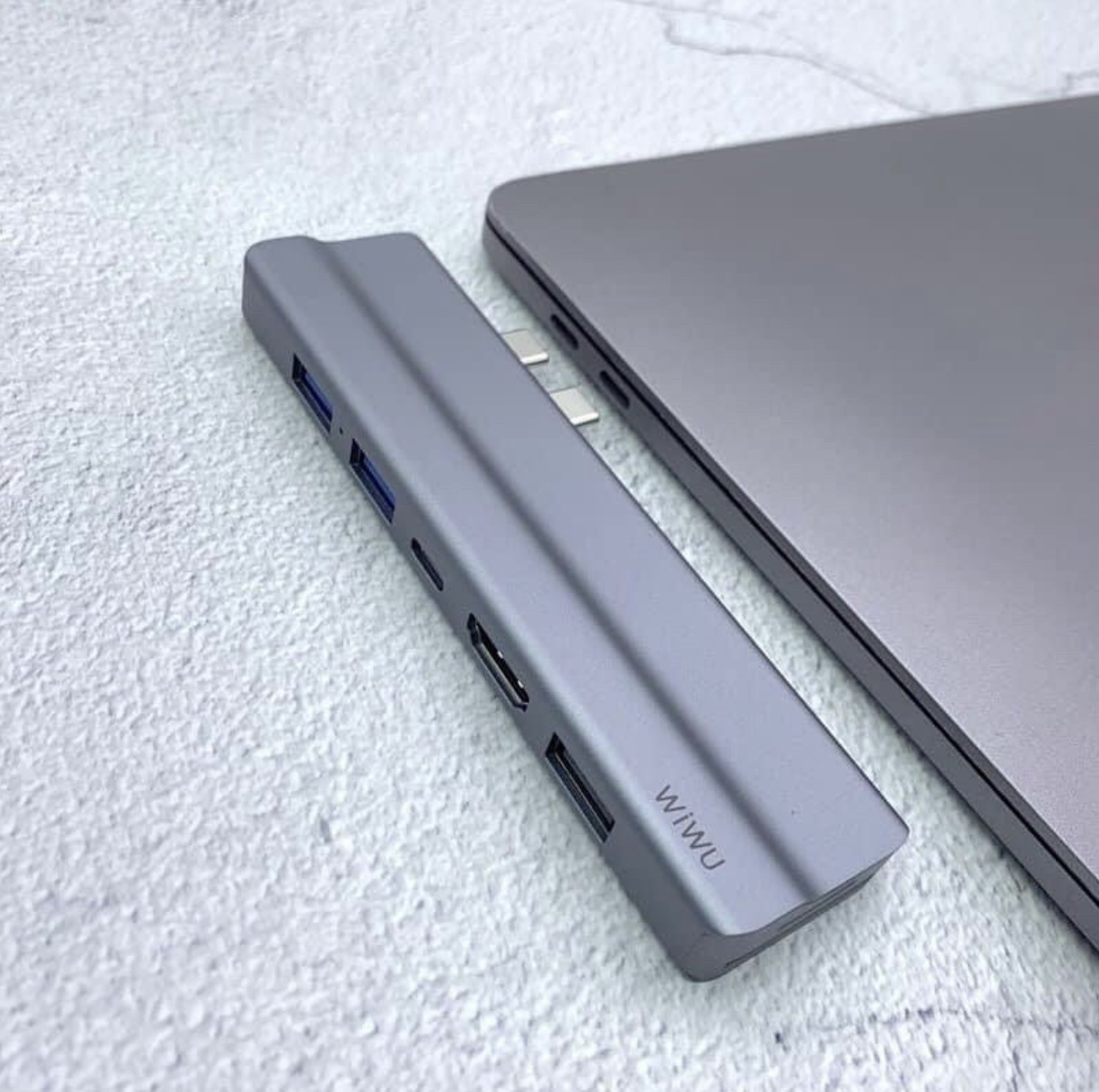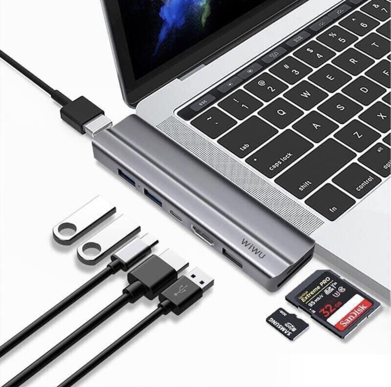 Hub #Wiwu Alpha 7 in 1 USB - C Hub #A731HC 3*USB3.0+ SD+TF+4K HDMI+100W PD Thương hiệu: #Wiwu Chất liệu: Hợp kim nhôm Thông số kỹ thuật: 3 cổng USB 3.0+1, 1 cổng TF, 1 cổng HDMI, PD, 1 cổng SD Đầu ra HDMI 4K: phản chiếu hoặc mở rộng màn hình của bạn với cổng HDMI của bộ chuyển đổi USB C và truyền trực tiếp video 4K UHD hoặc full HD 1080P tới HDTV, màn hình hoặc máy chiếu cho bữa tiệc hình ảnh như rạp chiếu phim. Hỗ trợ sạc PD: Ba cổng USB hỗ trợ tốc độ truyền tải, kết nối với #điện thoại thông minh, #máy tính bảng và #ổ cứng của bạn để truyền dữ liệu dễ dàng.