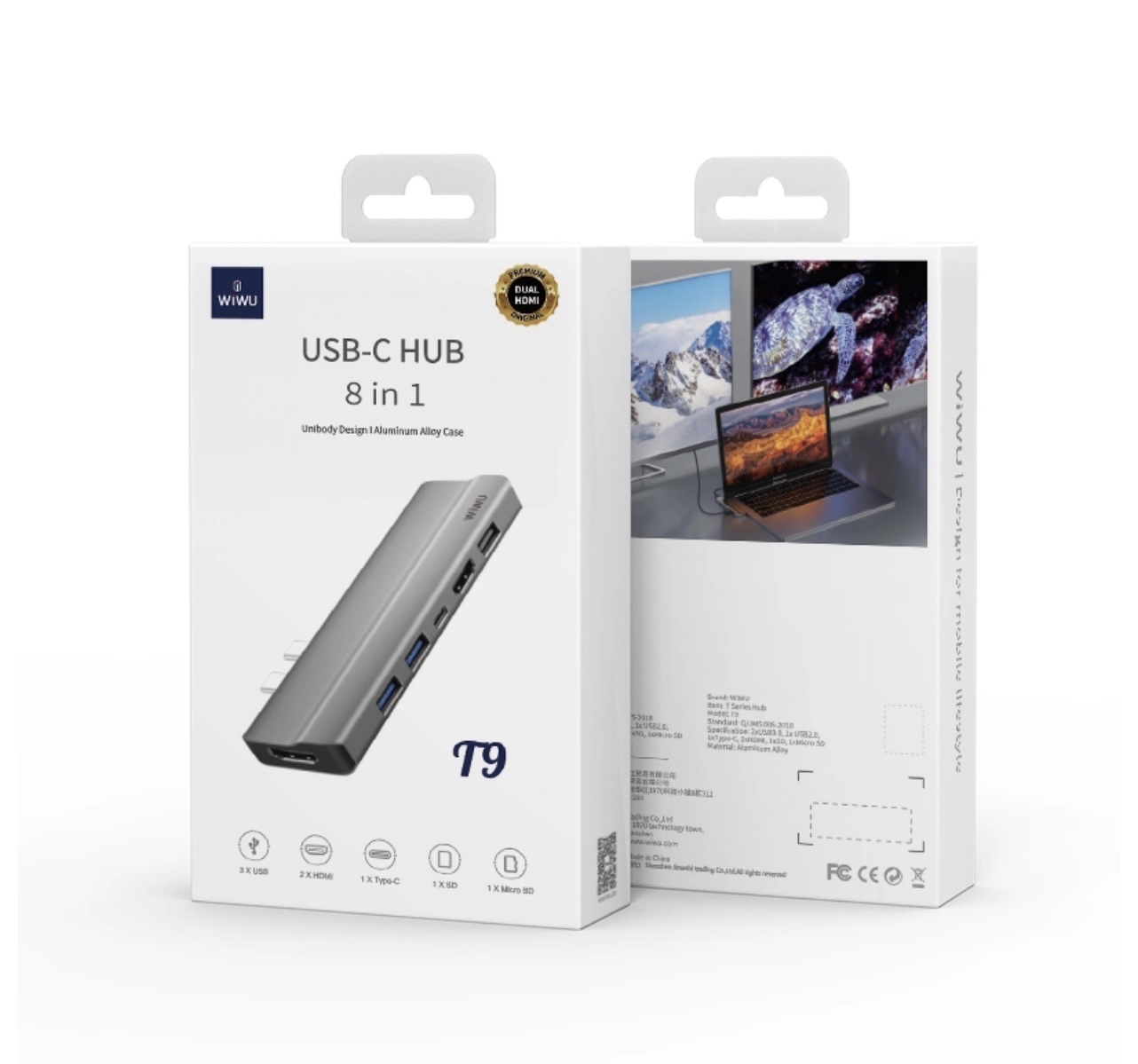 Mua tại TiktokWiwu T9 -. Hub 8 trong 1 USB-C - USB 3.0 - HDMI - SD - Khe cắm TF - Type-C Wiwu T9 là bộ chuyển đổi giúp kết nối nhiều thiết bị hoặc phụ kiện với các thiết bị của bạn như đĩa flash USB, chuột USB, bàn phím USB và hơn thế nữa. Thiết bị này có thể được sử dụng để truyền dữ liệu và sạc cùng lúc, cũng như có 1 cổng USB Type-C có thể sử dụng để sạc (hỗ trợ tốc độ truyền lên đến 10Gbps), 2 cổng USB 3.0 Cổng (hỗ trợ tốc độ truyền lên đến 10Gbps) (5Gbps) Và 1 cổng USB 2.0, sau đó 2 cổng HDMI hỗ trợ độ phân giải 4K và HD, cũng như 1 cổng thẻ SD và 1 cổng khe cắm thẻ TF. Nó rất dễ sử dụng, chỉ cần Plug in Play mà không cần cài đặt bất kỳ trình điều khiển nào. Tính năng chơi: