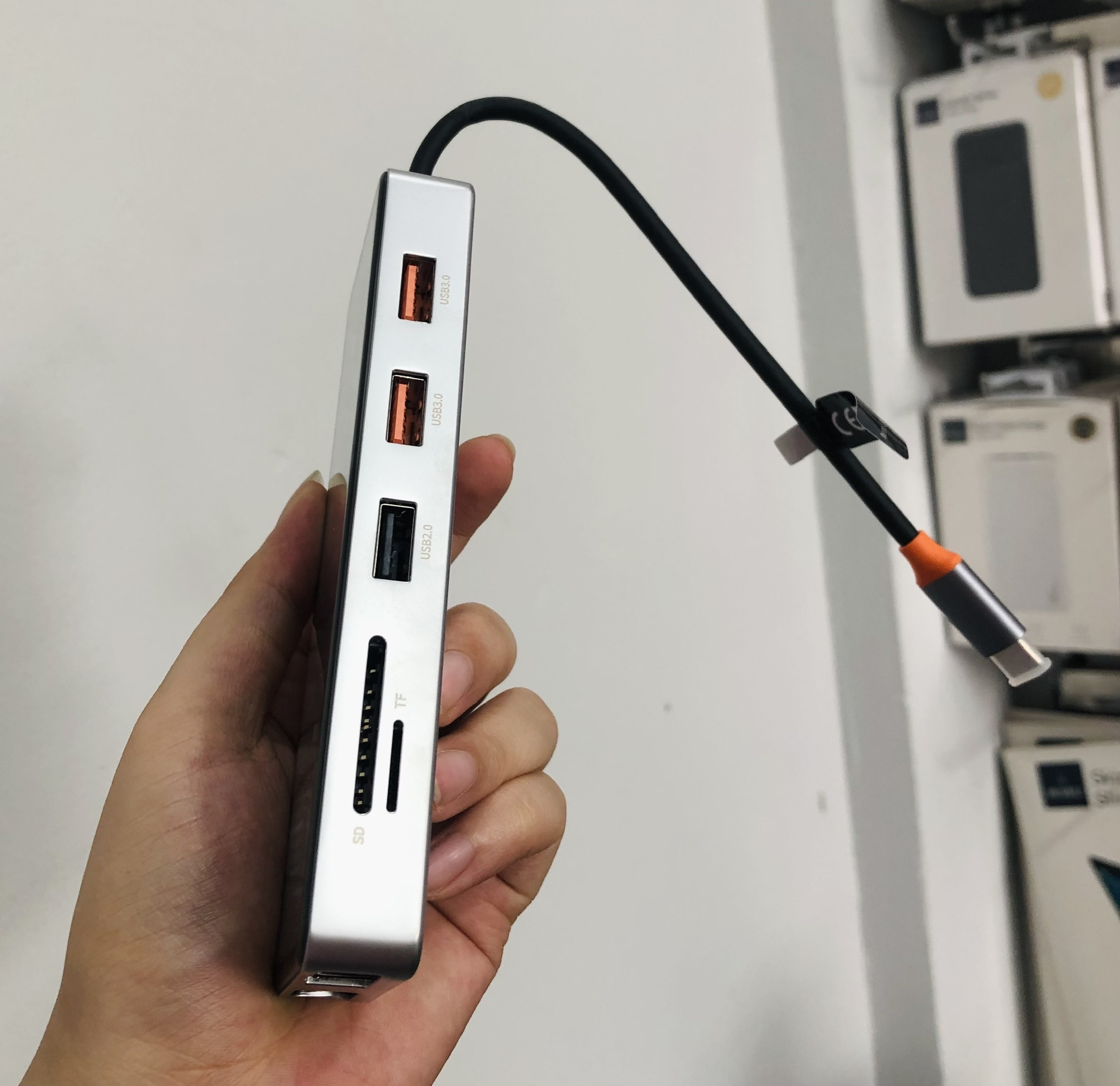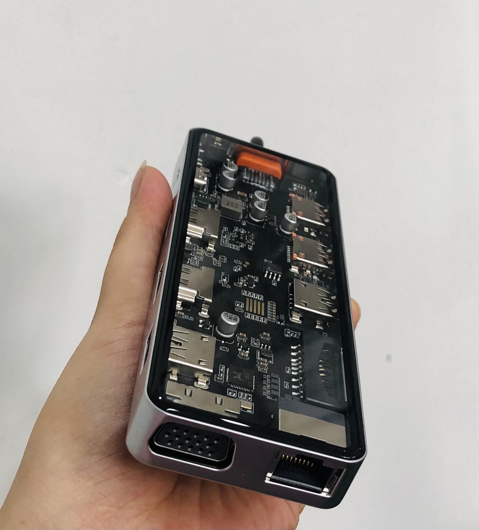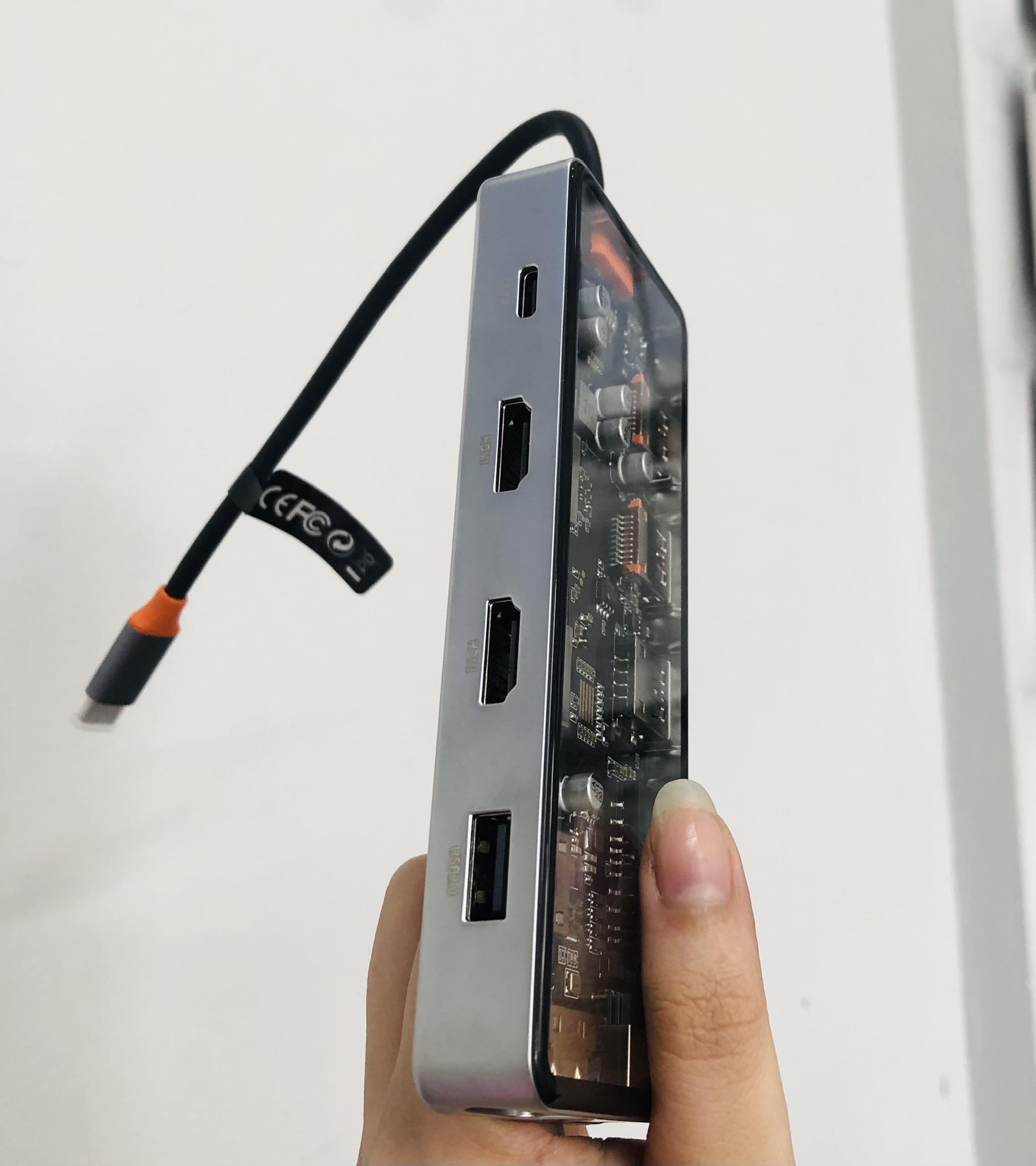 1. Features: Extend more connections from USB Type-c 2. Input: USB Type-C positive 3. Output: 2*usb-c + RJ45 + HDMI 4K60HZ + PD + SD + TF + 2*USB3.0 4. Material: aluminum alloy shell, gold-plated