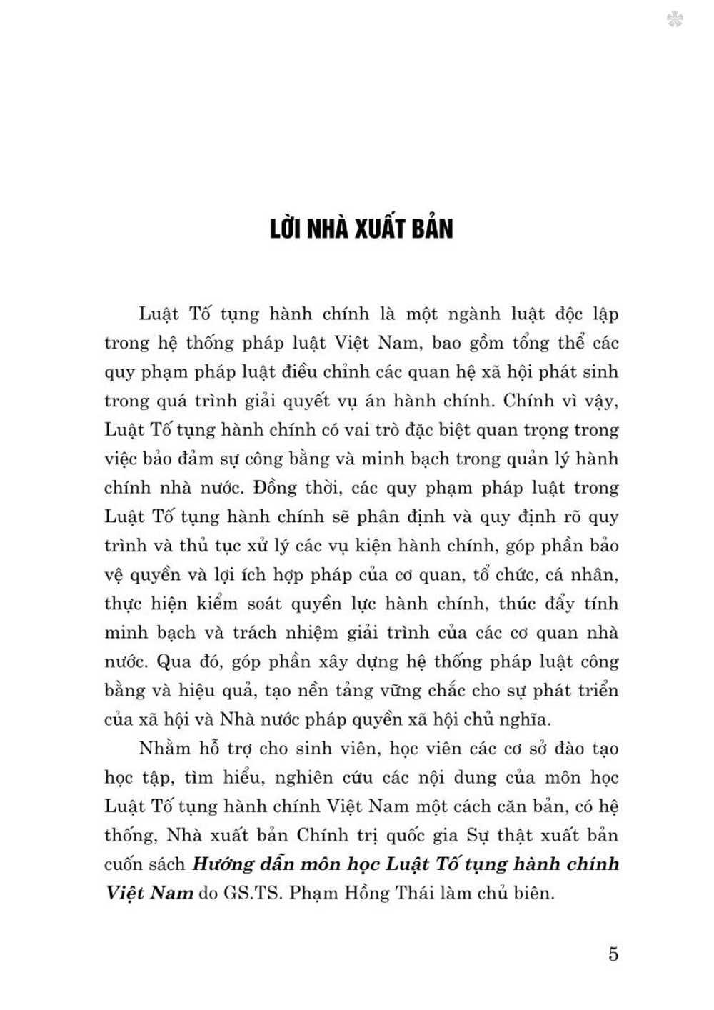 Nhằm hỗ trợ cho sinh viên, học viên các cơ sở đào tạo học tập, tìm hiểu, nghiên cứu các nội dung của môn học Luật Tố tụng hành chính Việt Nam một cách căn