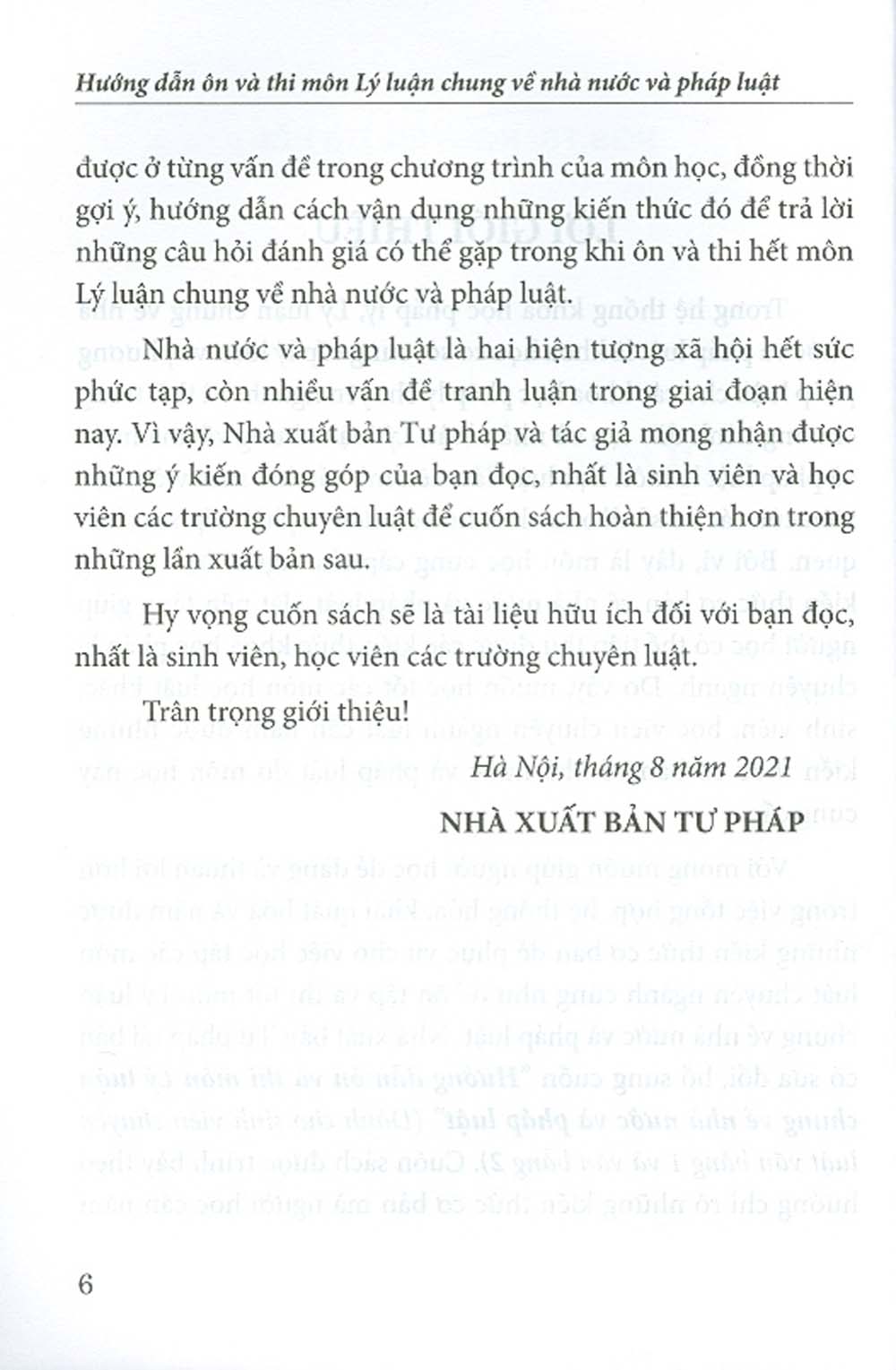 Với mong muốn giúp người học dễ dàng và thuận lợi hơn trong việc tổng hợp , hệ thống hóa, khái quát hóa và nắm được những kiến thức cơ bản để phục vụ cho việc học tập các môn chuyên ngành và thi tốt môn Lý luận chung về Nhà nước và Pháp luật, Nhà xuất bản Tư pháp bổ sung cuốn: "Hướng dẫn ôn và thi môn Lý luận chung về Nhà nước và Pháp luật" (Dành cho sinh viên chuyên luật văn bằng 1 và văn bằng 2)