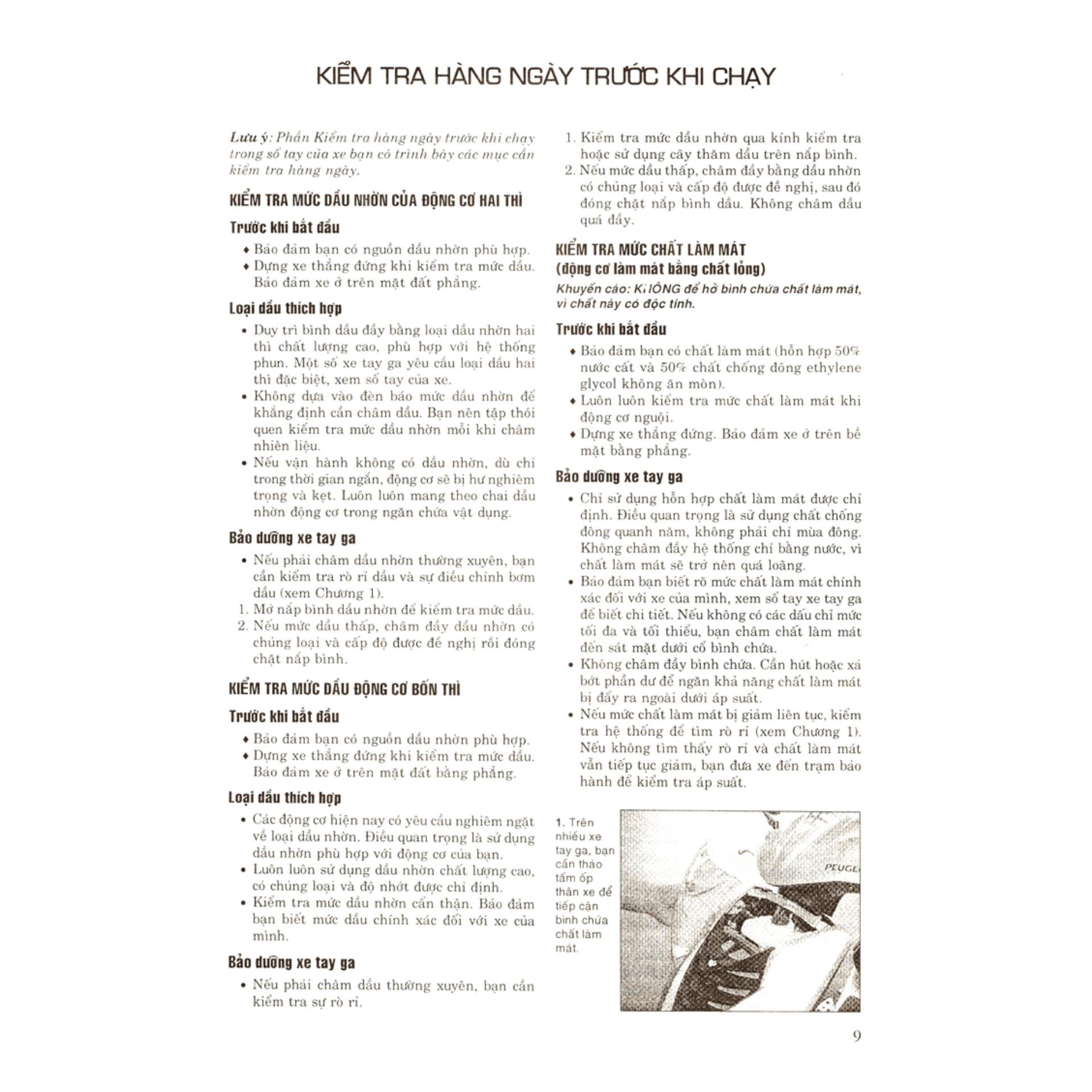 Cuốn sách này trình bày các hệ thống trên xe tay ga theo từng chương riêng biệt, với đầy đủ quy trình tháo lắp, kiểm tra, và thay các bộ phận của hệ thống. Mỗi quy trình được viết theo cách hướng dẫn từng bước để bạn có thể tự thực hiện và tận hưởng cảm giác thỏa mãn sau khi hoàn thành công việc. Ngoài ra, với những công việc đơn giản, tự thực hiện còn giúp bạn tiết kiệm thời gian.