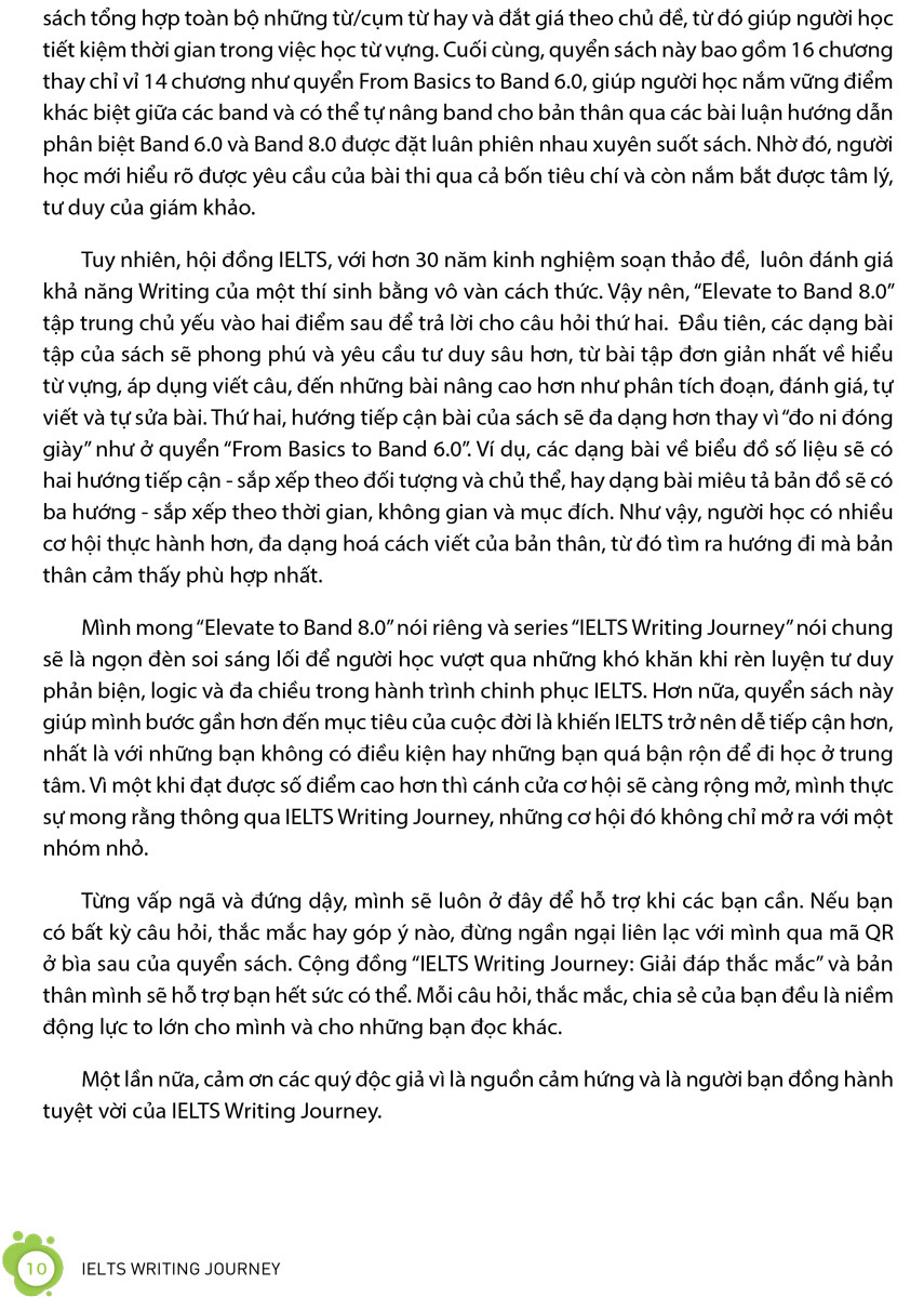 “Với cấu trúc chặt chẽ, hướng dẫn chi tiết, diễn đạt gần gũi, và cách trình bày bắt mắt, cuốn sách này chứa đầy đủ những gì bạn cần biết để đạt 8.0 Writing. Tôi tin rằng cuốn sách IELTS Writing Journey Elevate to Band 8 sẽ trở thành người bạn đồng hành đáng tin cậy, tiếp bước cho thí sinh vươn tới band điểm Writing mơ ước của mình.”