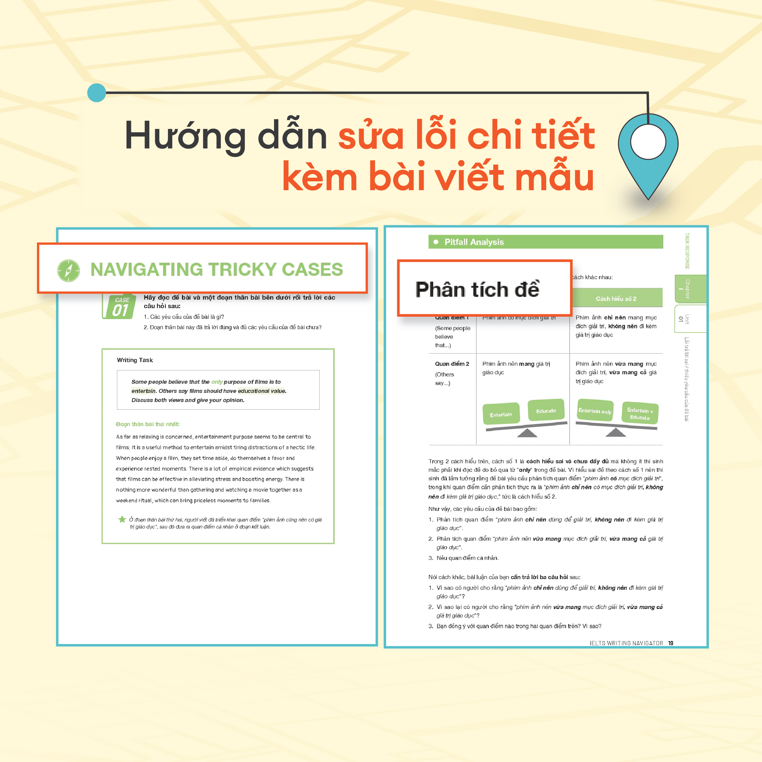 IELTS Writing Navigator là cuốn sách dành cho người muốn tự học IELTS và đặt mục tiêu chinh phục band điểm 7.0 IELTS Writing Task 2. Có thể coi đây là cuốn “cửu âm chân kinh” giúp người học hiểu được những kỳ vọng của người ra đề đối với thí sinh, đồng thời biết cách tự tìm và sửa lỗi để có thể viết được một bài luận hoàn toàn “sạch lỗi”.