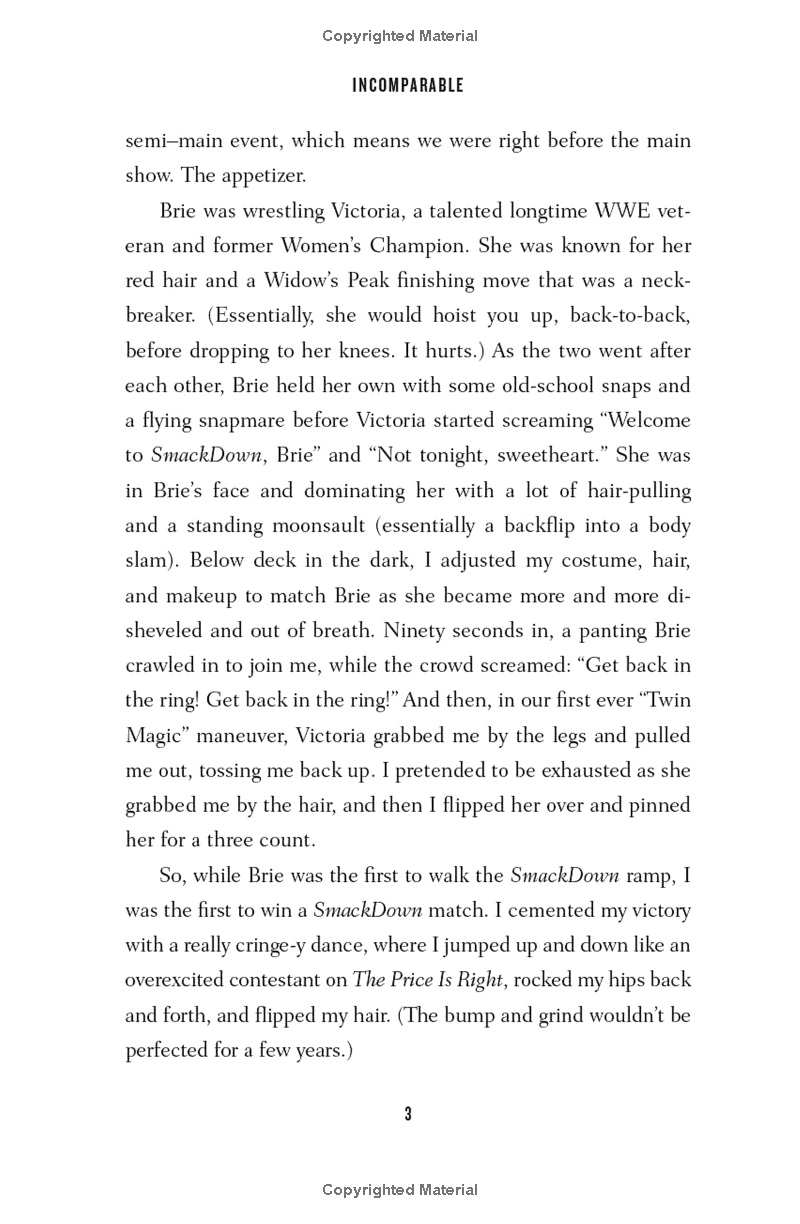 Incomparable THE INSTANT NEW YORK TIMES BESTSELLER A raw, honest, and revealing co-memoir by Brie and Nikki Bella: twin sisters, WWE Hall of Fame inductees, and stars of the hit E! shows Total Bellas and Total Divas. As twins, the