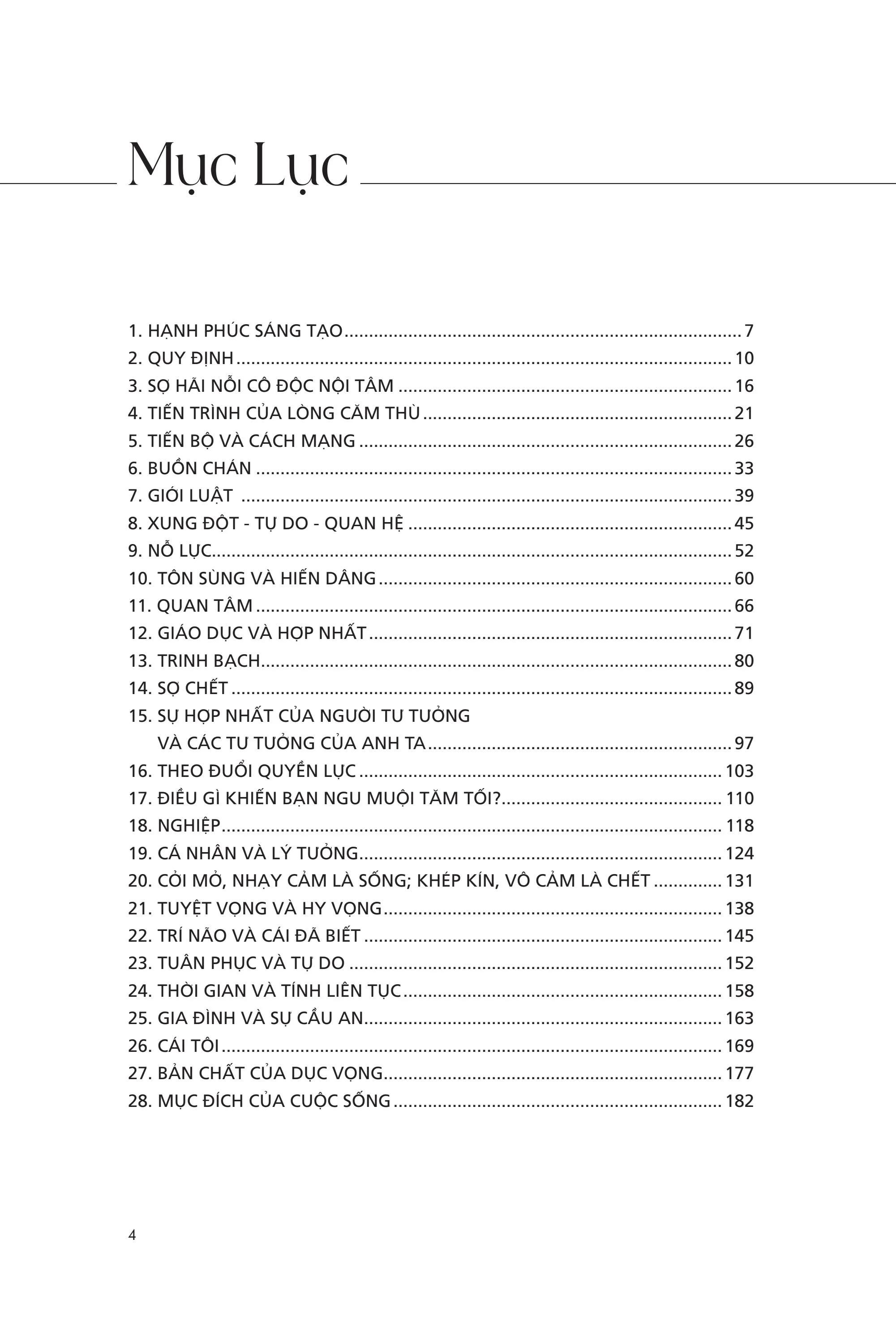 Sống hồn nhiên thật đơn giản biết bao! Nếu không có hồn nhiên thì không thể sống hạnh phúc. Niềm vui của cảm giác không phải là hạnh phúc của hồn nhiên. Hồn nhiên là thoát khỏi gánh nặng ngàn năm của kinh nghiệm. Chính ký ức của kinh nghiệm mới làm hư hoại, chứ không phải tự thân động thái kinh nghiệm. Kiến thức, tức gánh nặng của quá khứ, đã làm hư hỏng, bại hoại. Chính khả năng để tích lũy, sự cố gắng để trở thành đã hủy hoại hồn nhiên; và nếu không có hồn nhiên thì làm sao có thể có trí tuệ. Người mà chỉ hiếu kỳ, tò mò, tìm hiểu thôi thì không bao giờ có thể biết được trí tuệ; họ sẽ tìm thấy nhưng điều họ tìm được không phải là sự thật. Người hoài nghi không bao giờ có thể biết được hạnh phúc, bởi vì hoài nghi là lo âu về chính cuộc sống của m.ình, và sợ hãi tạo ra hủy hoại. Không sợ hãi không phải là can đảm mà là tự do khỏi sự tích lũy.