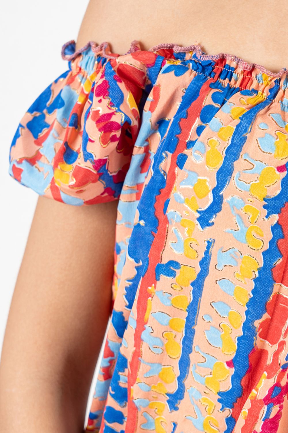 Jumpsuit Trễ Vai Isla Bonita, chất lụa mềm mại, nền vải vẽ ánh kim tinh tế. Vai thun co giãn, có thể mặc trễ vai hoặc kín vai. Có 2 túi phía sau. Lưng thun