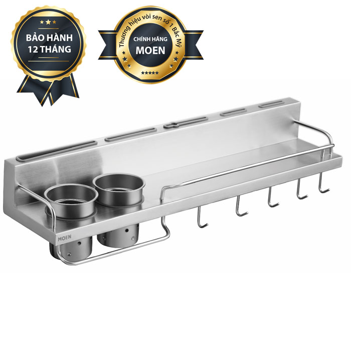 Mua tại TiktokKỆ GIA VỊ ĐA NĂNG KÈM 2 ỐNG ĐŨA, MÓC TREO MOEN - KAC0104SL Chất liệu: Inox 304 Sản phẩm của MOEN - Thương hiệu vòi sen số một tại Mỹ Bao gồm kệ gia vị, 2 ống đũa, khe đựng dao kéo, bộ 10 móc treo Lớp mạ nhám chống bẩn, chống vân tay Góc cạnh bo tròn tránh nguy hiểm Lớp nhựa cao su bảo vệ lưỡi dao, kéo Ống đũa có nắp và lỗ thoát nước tránh ẩm mốc