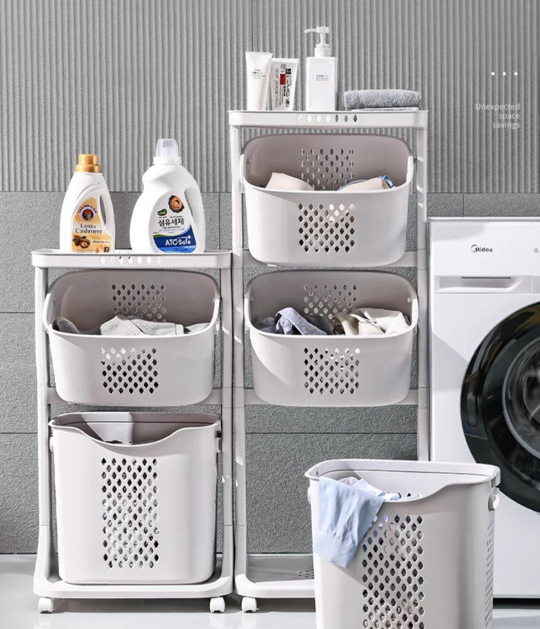 “Kệ đựng đồ 3 tầng có bánh xe” giúp mẹ để : đồ chơi, quần áo , tã hay khăn của con thay ra trong ngày thì chỉ cần 1 động tác nhấc giỏ đi giặt là xong ngay mẹ nhé!️