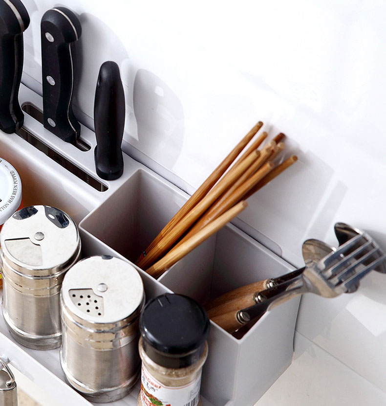 - Kệ đựng gia vị nhà bếp đa năng có thiết kế thông minh, nhỏ gọn, đa năng, tiết kiệm diện tích giúp giải quyết và thay thế toàn bộ các giá đựng gia vị, khe cắm dao, móc treo kéo, thìa, dụng cụ nhà bếp, ống đựng đũa thìa nĩa, dao, gia vị,...
