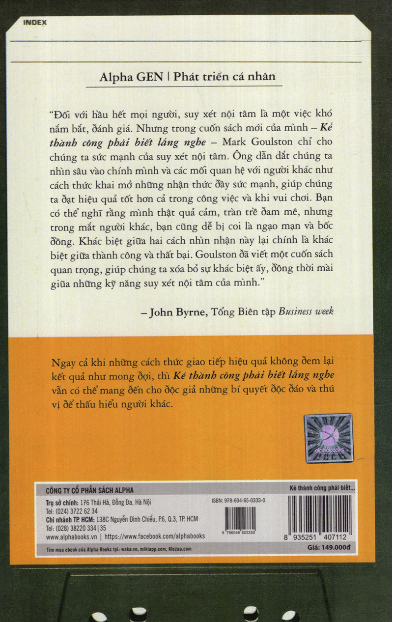 Rào cản trong giao tiếp giữa con người sẽ trở thành rào cản đối với sự thành công, sự phát triển cũng như hạnh phúc.Do vậy, việc vượt qua những rào cản đó không chỉ đơn thuần là một nghệ thuật, nó còn là một kỹ năng tối cần thiết. Kẻ Thành Công Phải Biết Lắng Nghe cung cấp cho bạn những phương pháp cũng như sự tự tin để có thể tiếp cận được những con người mà bạn luôn cho là mình không thể với tới, và khiến những mối quan hệ khó khăn trở thành những mối quan hệ hiệu quả và mang lại nguồn lợi vô tận!
