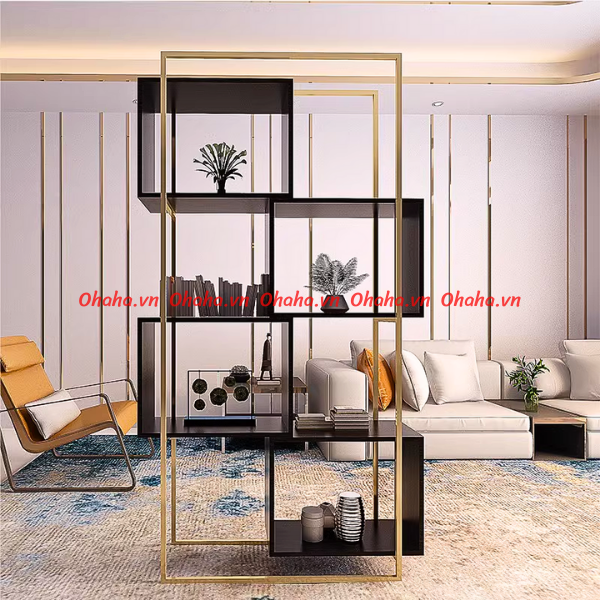 Kệ trang trí phòng khách thiết kế sang trọng Ohaha - KTT012 được kết hợp giữa hai chất liệu chủ đạo là gỗ MDF chống ẩm và khung sắt, giúp bạn không phải tốn quá nhiều thời gian, công sức và chi phí để trang trí lại căn phòng của mình. Mẫu thiết kế với kiểu dáng hiện đại dành cho phòng làm việc, phòng khách hay văn phòng có diện tích đa dạng để bạn có thể trang trí những khu vực đó một cách gọn gàng đẹp mắt và vô cùng tiện nghi. Đặc biệt, kệ có thể dùng như vách ngăn giữa các không gian chức năng khác nhau của văn phòng, vừa thông thoáng, vừa đẹp mắt.
