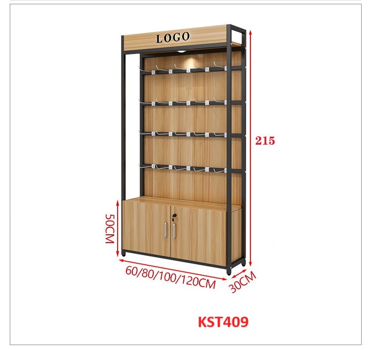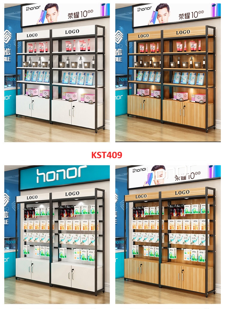 • Kệ gỗ khung sắt có tủ kết hợp hệ thống đèn led làm nỗi bật sản phẩm trưng bày trên kệ.