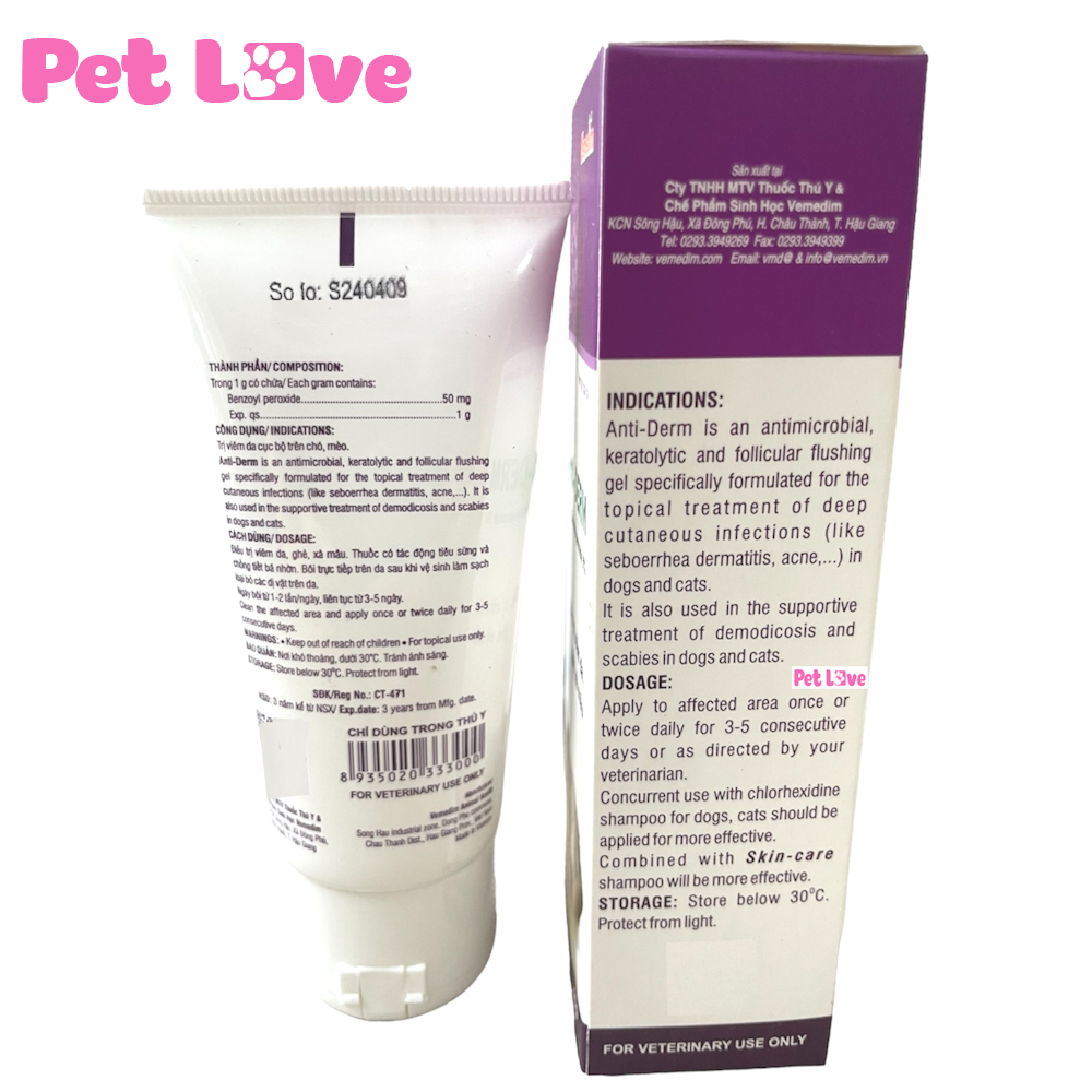 - Sản phẩm của công ty Vemedim. THÀNH PHẦN: Trong 1g có chứa: Benzoyl peroxide 5mg Tá dược vừa đủ 1g HƯỚNG DẪN SỬ DỤNG: Bôi trực tiếp lên da thú cưng sau khi đã vệ sinh và loại bỏ các dị vật trên da. Mỗi ngày bôi từ 1-2 lần, liên tục trong 3-5 ngày. Có thể kết hợp với sữa tắm Skin Care để đẩy nhanh quá trình hồi phục. BẢO QUẢN: Nơi khô thoáng, dưới 30 độ C. Tránh ánh sáng. Bộ sản phẩm bao gồm: 1 tuýp (40g)