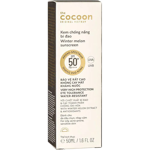 Kem chống nắng bí đao Cocoon Winter Melon Sunscreen SPF 50+ PA++++ giúp bảo vệ da Thành phần: Chiết xuất bí đao và các thành phần chống ôxi hoá gồm: Vitamin E, Vitamin B3, Hydroxymethoxyphenyl