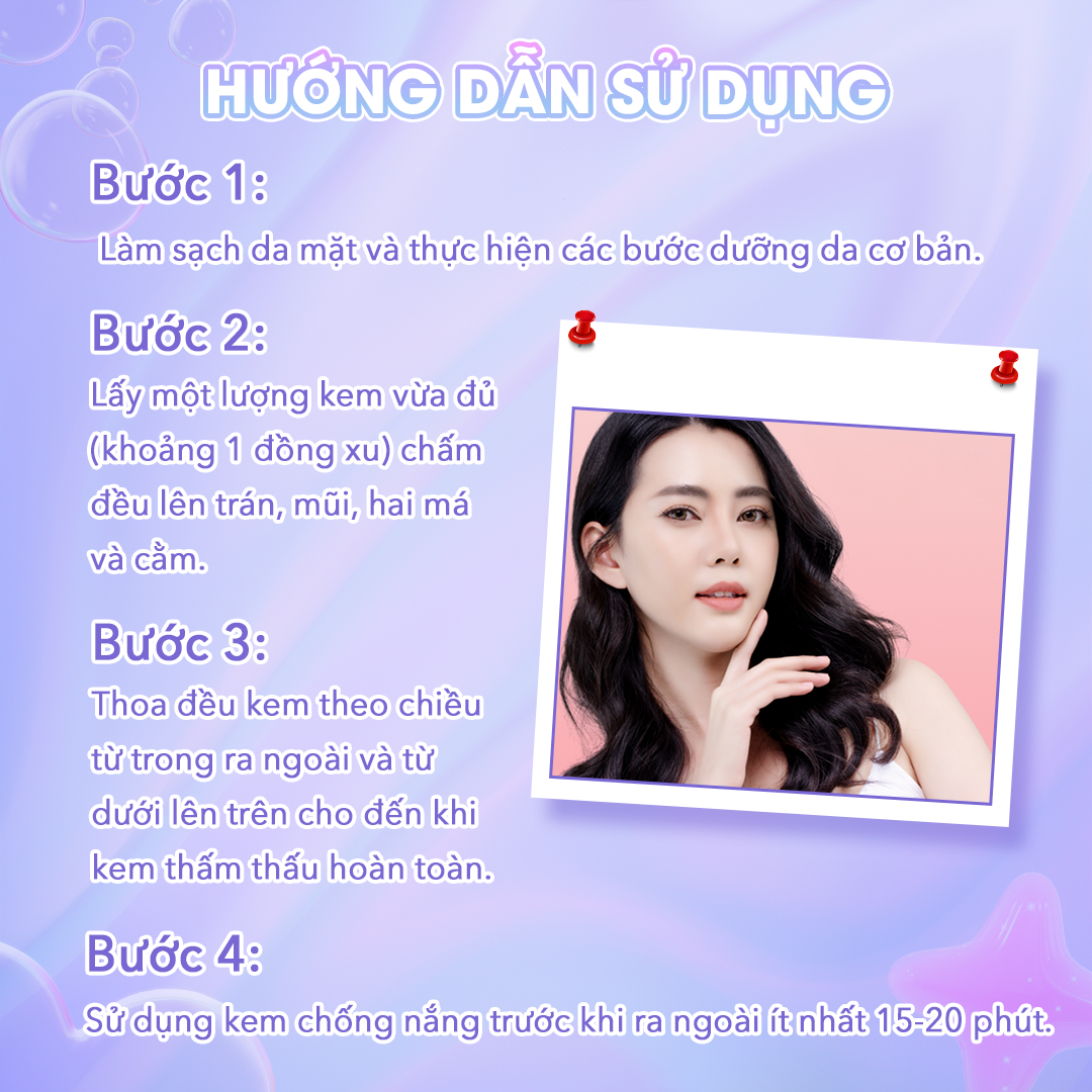 - Nâng tone nhẹ nhàng: Kem có khả năng nâng tone da tự nhiên, mang lại làn da sáng mịn mà không gây bết dính. HƯỚNG DẪN SỬ DỤNG & BẢO QUẢN Hướng dẫn sử dụng:
