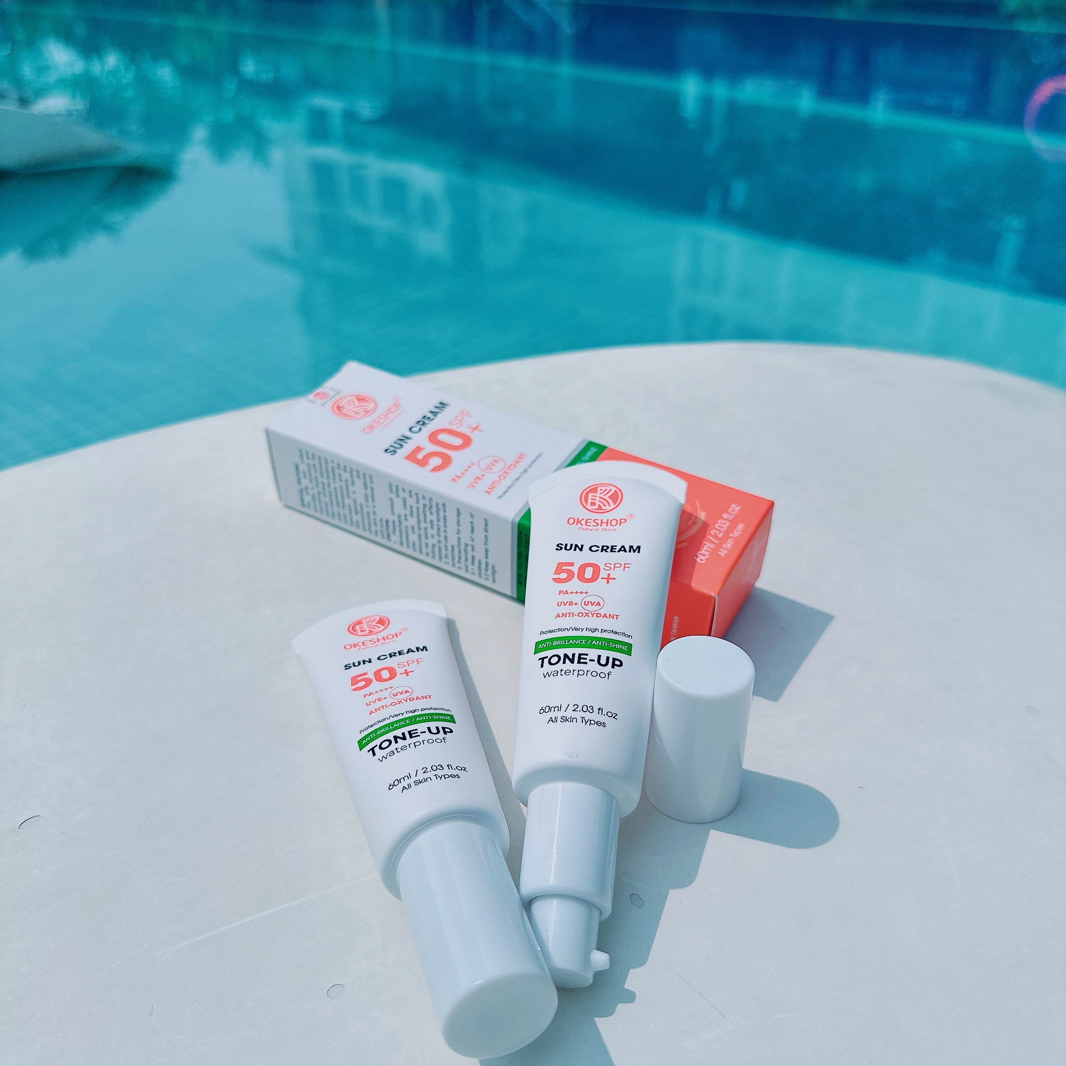 Thoải mái tận hưởng những chuyến du lịch ngoài trời mà không phải lo làn da bị đen sạm nữa, là sản phẩm chống nắng cho mọi loại da OKESHOP SPF 50+ PA++++ Anti-oxydant sẽ là lựa chọn tối ưa cho ngày hè sắp tới Chống nắng TONE-UP OKESHOP SPF 50+ PA++++ Anti-oxydant 60ml Ngày nay trên thị trường mỹ phẩm có vô vàn các sản phẩm kem chống nắng nếu vẫn chưa biết lựa chọn sản phẩm nào để sử dụng thì hãy thử dòng sản phẩm kem chống nắng nâng tông của OKESHOP chắc chắn đây sẽ là sản phẩm khiến bạn cảm thấy hài lòng. CÔNG DỤNG TONE-UP OKESHOP SPF 50+ PA++++ Anti-oxydant 60ml SUN CREAM OKESHOP SPF 50+ PA++++ Anti-oxydant 60ml giúp ngăn chặn 99% tia UV với chỉ số chống nắng cao SPF50+ PA++++ chống được tối đa tia UVA/UVB ngay cả khi bạn không trang bị cho mình đầy đủ áo, khẩu trang khi ra ngoài. OKESHOP SPF 50+ PA++++ Anti-oxydant 60ml giúp bảo vệ làn da của bạn an toàn dưới ánh nắng mặt trời mà vẫn dịu nhẹ, không gây hại cho da. Chỉ số SPF 50+ cho khả năng chống tia UVB trong thời gian dài bảo vệ làn da không bị cháy nắng, sạm đen. Chỉ số PA++++ ngăn chặn triệt để tia UVA - là tác nhân gây nên hiện tượng lão hóa da sớm như hình thành nếp nhăn, đốm nâu. SUN CREAM OKESHOP sẽ giúp nuôi dưỡng cho làn da bạn luôn ẩm mượt, gia tăng độ đàn hồi, chống oxi hóa, tăng cường sức khỏe cho da khỏe mạnh, bảo vệ da khỏi những tác động tiêu cực từ môi trường. Đồng thời, kem chống nắng còn bổ sung lượng nước, cấp ẩm dồi dào giúp làn da mềm mại, mượt mà hơn với chiết xuất dưỡng da từ thiên nhiên của hoa trà xanh, nha đam, hắc mai biển mang lại cho các nàng một cảm giác thoải mái dịu nhẹ thanh mát trong cả ngày dài Một điểm cộng của TONE-UP OKESHOP SPF 50+ PA++++ Anti-oxydant 60ml nữa đó chính là khả năng chống thấm nước, mồ hôi và kể cả lượng dầu nhờn tiết ra trên da nên chúng ta không phải lo lắng lớp kem chống nắng sẽ bị trôi mất. Cũng chính vì tính năng thẩm thấu sâu vào bên trong bề mặt da nhanh chóng nên đây sẽ là sản phẩm lý tưởng để sử dụng mỗi khi đi tắm biển, bơi lội hay tiếp xúc môi trường nước. HƯỚNG DẪN SỬ DỤNG: