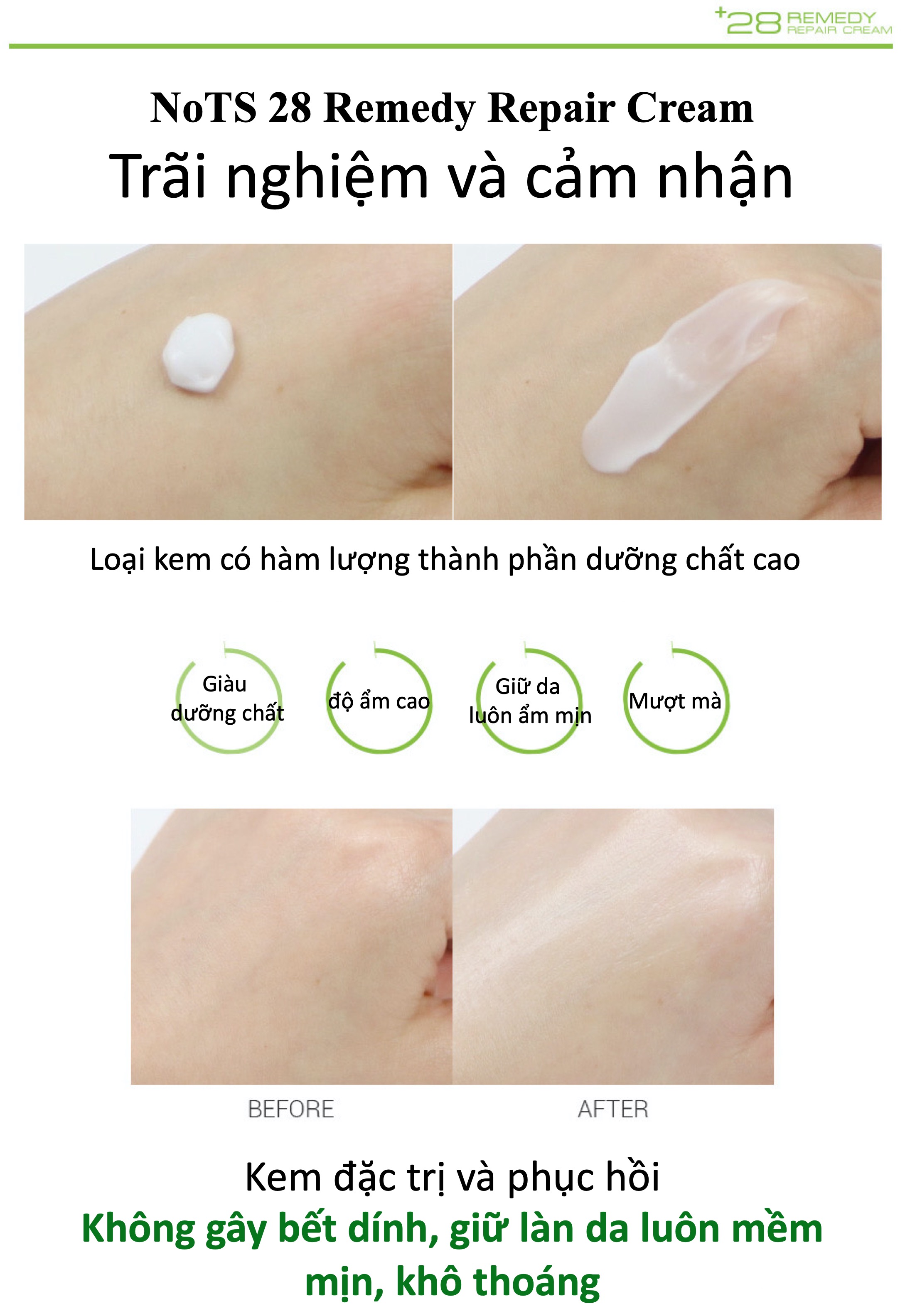 • Kem dưỡng phục hồi và tái tạo da NoTS 28 Remedy Repair Cream có khả năng làm dịu tổn thương do mụn, do kích ứng cho da