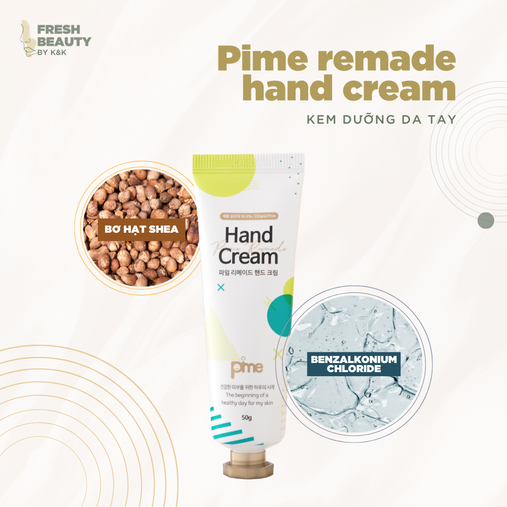 Ngoài ra, nhờ chức năng kháng khuẩn nên kem dưỡng da tay Pime còn dùng được với các làn da tay bị mẩn ngứa hay viêm da cơ địa Sản phẩm nhập khẩu chính hãng từ Hàn Quốc và được Bộ Y Tế cấp phép lưu hành. Fresh Beauty by K&K ra đời với sứ mệnh là kênh phân phối chính thức những dòng sản phẩm chăm sóc sắc đẹp, sức khỏe có nguồn gốc thiên nhiên, xuất xứ rõ ràng, chất lượng nhất từ Nhật Bản, Hàn Quốc và các quốc gia khác