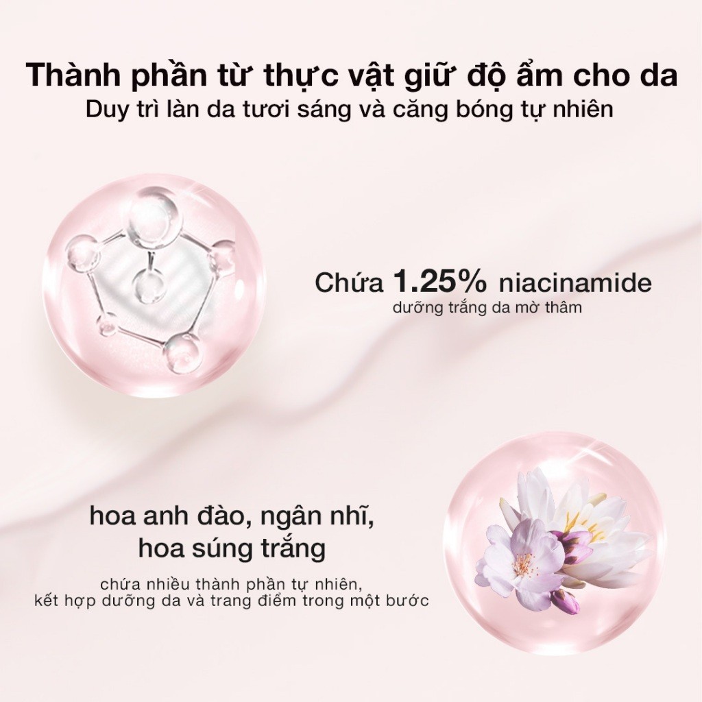 - Thành phần từ thực vật giữ độ ẩm cho da. Duy trì làn da tươi sáng và căng bóng tự nhiên. Chứa 1.25% niacinamide (dưỡng trắng da mờ thâm), hoa anh đào, ngân nhĩ, hoa súng trắng (chứa nhiều thành phần tự nhiên, kết hợp dưỡng da và trang điểm trong một bước)