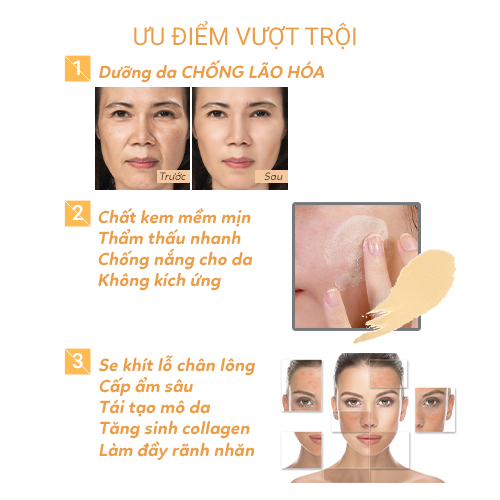 - Chống lão hóa Bổ sung dưỡng chất, hỗ trợ tái tạo da, tăng cường sức đề kháng giúp da chống lão hóa hiệu quả, Tăng cường độ đàn hồi cho da, xóa mờ nếp nhăn, đẩy lùi dấu hiệu lão hóa.