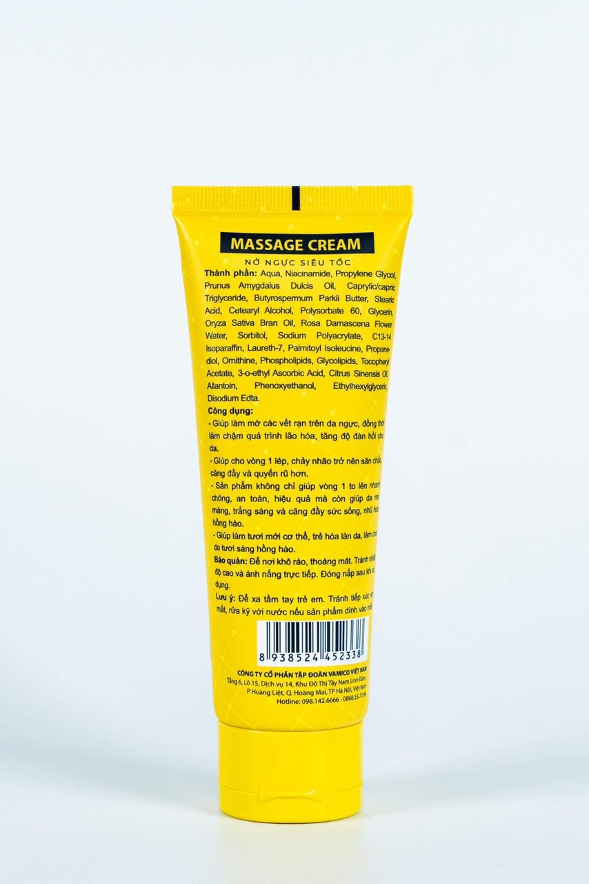 - CÁCH SỬ DỤNG KEM MASSAGE CREAM Bước 1: Rửa sạch vòng 1 và các vùng da xung quanh bằng nước ấm, dùng khăn mềm thấm nước lau khô; Bước 2: Dùng một lượng kem vừa đủ bôi lên vùng da đã vệ sinh sạch sẽ; Bước 3: Massage ngực phải trong vòng 5- 10 phút, lặp lại 2 lần như vậy để đảm bảo kem thấm đều trên da. Làm tương tự đối với ngực bên trái và đợi đến khi kem khô hoàn toàn; Bước 4: Khi kem đã khô thì bạn tiếp tục thực hiện động tác massage như trên cả 2 bên ngực. Thực hiện động tác massage theo hình kim đồng hồ hoặc hình xoắn ốc; Duy trì thực hiện 2 lần/ ngày mỗi buổi sáng thức dậy và trước khi đi ngủ để thu được hiệu quả tốt nhất.