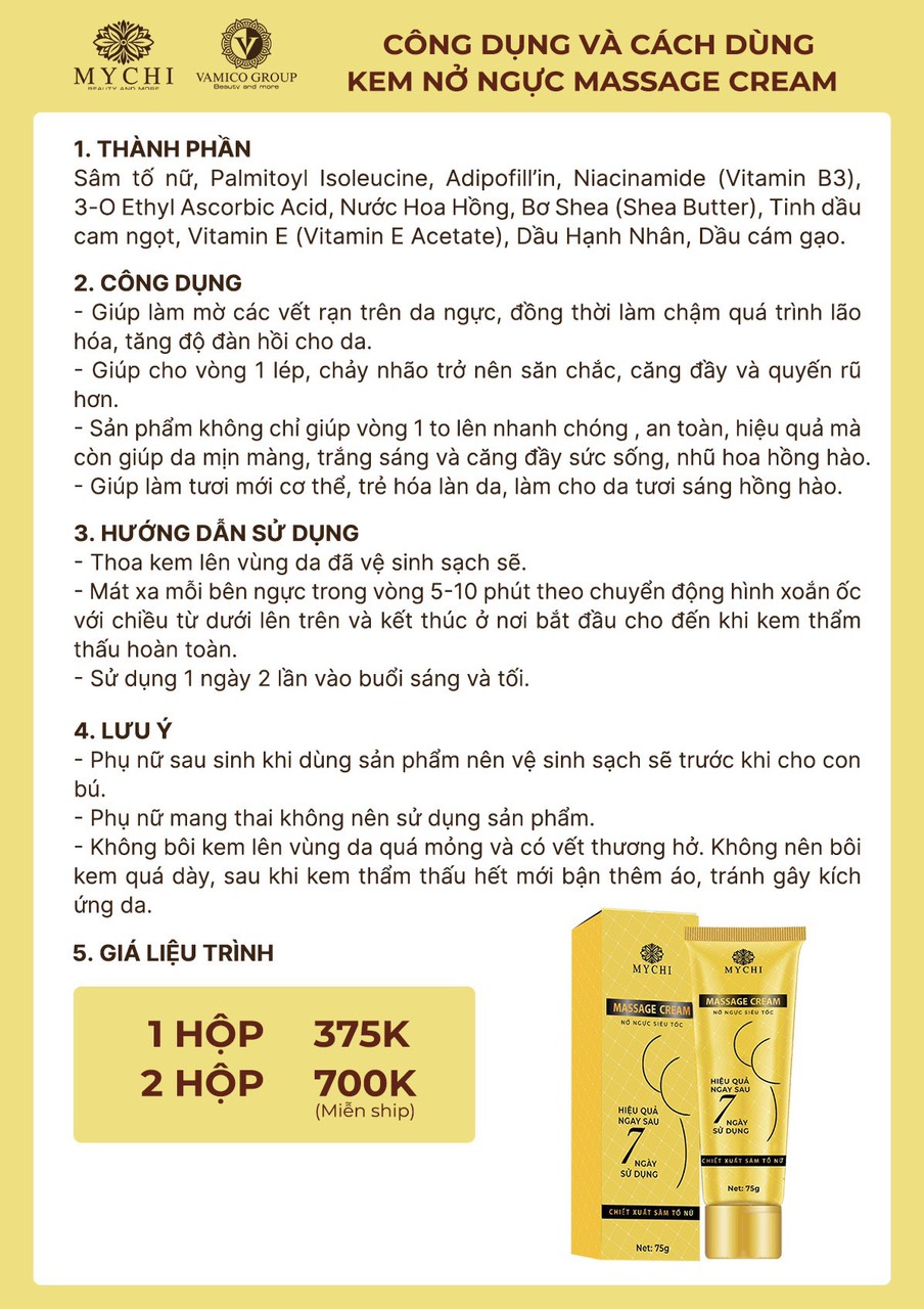 Kem Nở Ngực - Massage Cream Mychi - Vamico group 1. CÔNG DỤNG - làm nở nguc, tăng kích thước vòng 1 tự nhiên, hồng nhu hoa, chống chảy xệ, xóa bỏ vết nứt, rạn sau