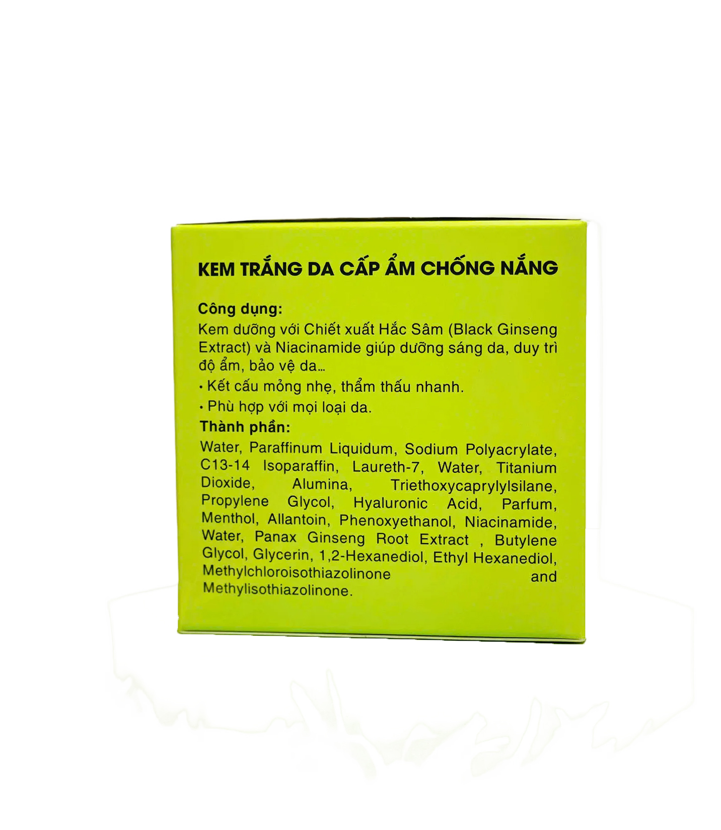 Công dụng: Kem dưỡng với Chiết xuất Hắc Sâm (Black Ginseng Extract) và Niacinamide giúp dưỡng sáng da, duy trì độ ẩm, bảo vệ da… Kết cấu mỏng nhẹ, thẩm thấu nhanh. Phù hợp với