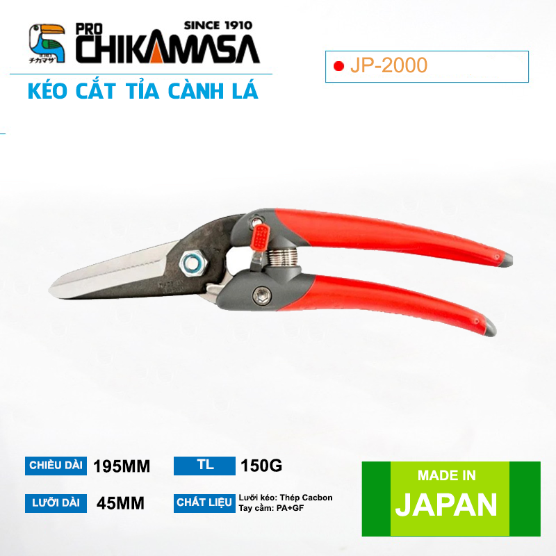 - Lực cắt kéo cắt cành Chikamasa JP-2000 Là dòng kéo cắt cành thiên về sức mạnh, Chikamasa JP-2000 có dạng lưỡi vòng đi qua nhau, ép dập cành nhánh trước khi cắt rời. Kết hợp khớp quay và lò xo nén cho ra lực bấm mạnh mẽ và dứt khoát, nhanh chóng cắt đứt cành cây. Những cú bấm trên công cụ Chikamasa luôn tỏ ra uy lực, không gây nham nhở hay làm biến dạng chỗ cắt. THÔNG SỐ KỸ THUẬT