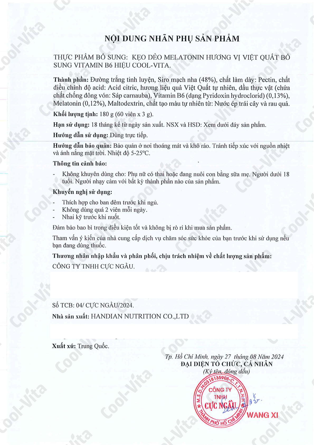 Đường trắng tinh luyện, Siro mạch nha (48%), chất làm dày (Pectin), chất điều chỉnh độ acid: Acid citric, hương liệu quả việt quất tự nhiên, dầu thực vật (chứa chất chống đông vón: Sáp carnauba), Vitamin B6 (dạng Pyridoxin hydrochloric 0,13%), Melatonin (0,12%), Maltodextrin, chất tạo màu tự nhiên. Nước ép trái cây và rau quả.