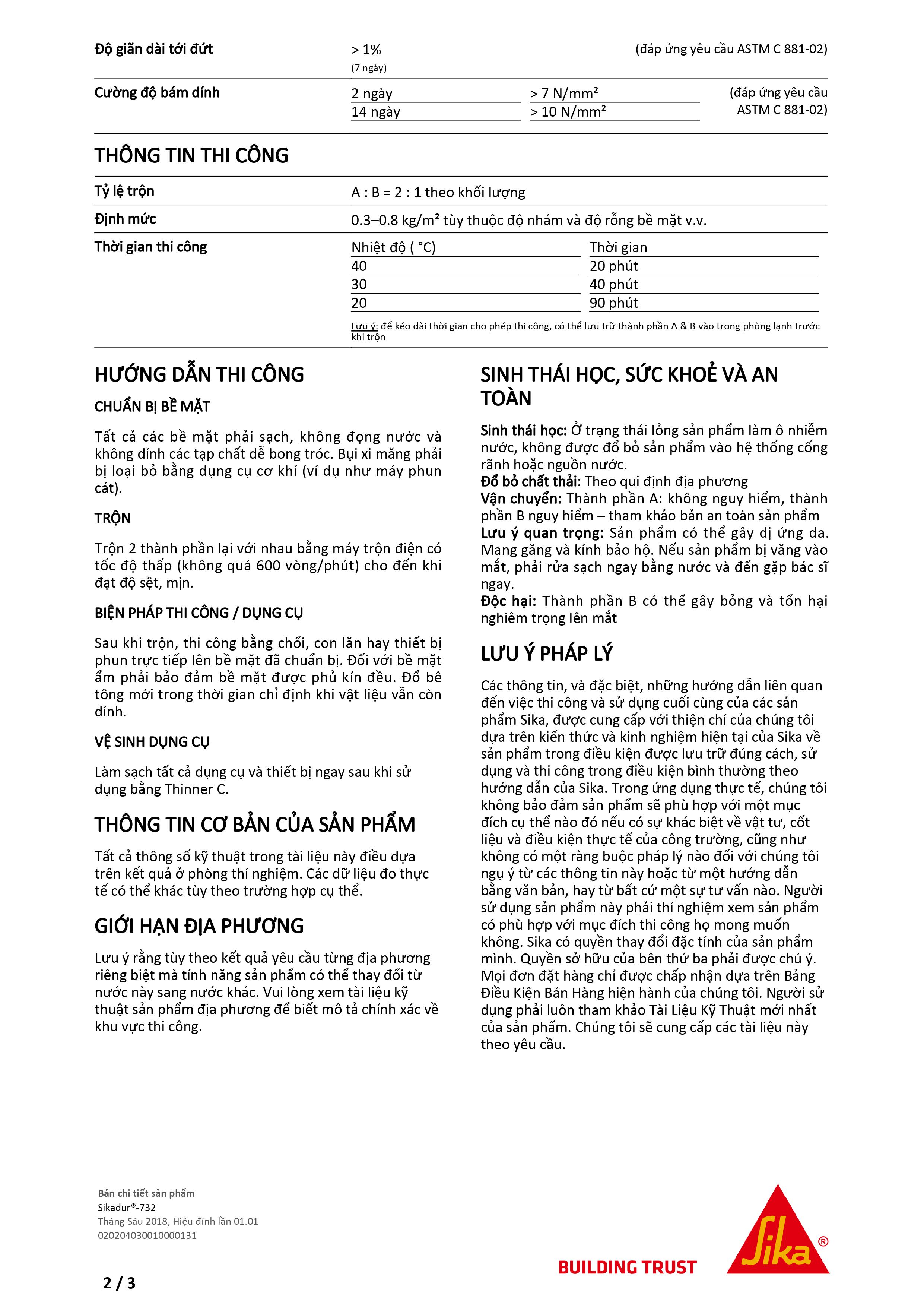 - Bụi xi măng phải bị loại bỏ bằng các phương tiện cơ học (ví dụ như máy thổi cát) Trộn: Trộn 2 thành phần lại với nhau trong vòng ít nhất 3 phút bằng cần trộn điện có tốc độ thấp không quá 600 vòng/phút cho đến khi hỗn hợp trở nên mịn, sệt và có màu xám đều. Thi công: