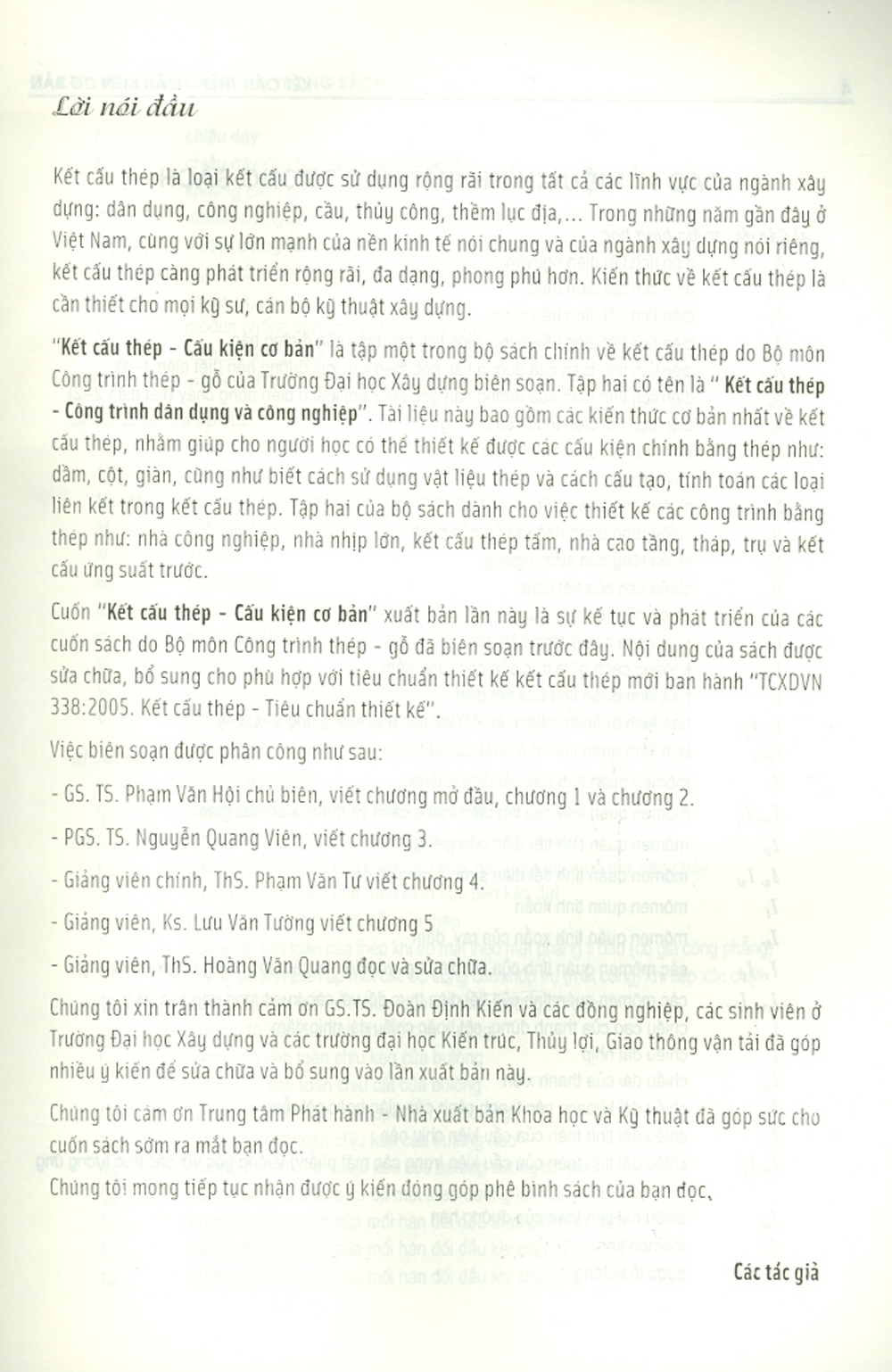 Cuốn "Kết cấu thép - Cấu kiện cơ bản” xuất bản lần này là sự kế tục và phát triển của các cuốn sách do Bộ môn Công trình thép - gỗ đã biên soạn trước đây. Nội dung của sách được sửa chữa, bổ sung cho phù hợp với tiêu chuẩn thiết kế kết cấu thép mới ban hành TCXDVN 338:2005. Kết cấu thép - Tiêu chuẩn thiết kế".